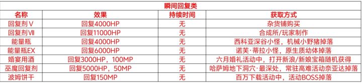 (2024年4月13日更新完成)原表格文件发在群里:958843274宇宙安全声明:本帖只收录常用性价比最高或药效最强的,并不是全收纳。本帖已做好药品分类,只要不是同类型的一起吃都不会冲突,请放心用药!若发现有标注错误的地方可以在下面回复我,谢谢。一次性回复类(瞬间回复)HP回复类(持续回复)MP回复类(持续回复)增加HP类(增加上限)增加MP类(增加上限)ATK强化类MA