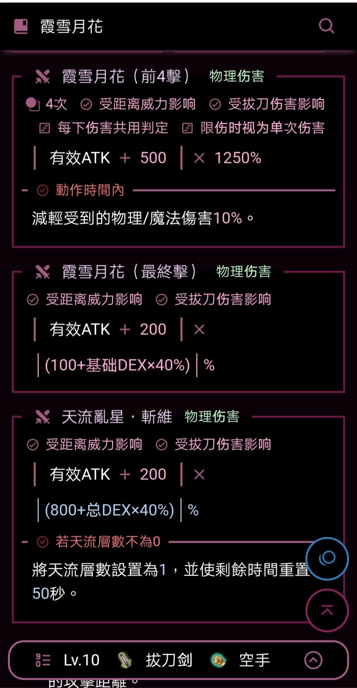 虽然我没有玩国际服,但作为未来战士,我也一直在了解五阶技能的动向,特别是拔刀的五阶技能。我个人感觉,游戏官方对五阶技能的调整应该结束了,或者说我个人认为现在的五阶技能是性能恰当的。嗯,或许对斧枪的调整有点差强人意吧(注意:[差强人意]的意思是勉强还算能让人满意),但其他武器职业我觉得十分完美。我玩拔刀,所以重点说说拔刀的五阶。【霞雪月花】:天流乱星的又一个变招技能。它和断祸、斩铁的变招【天流乱