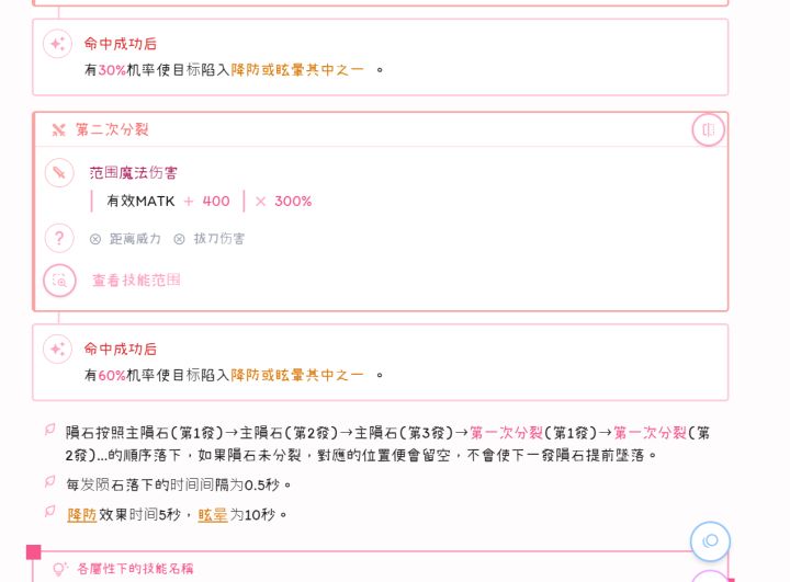 【由于板块问题没办法一个技能一个图的详细介绍,只能先介绍技能机制,然后把所有技能图放在下方一起】魔法炮五阶法师的绝大部分输出来源,它的核心技能分为两段第一段为充能阶段,不会扣mp,在100%以下以每秒1%提升,100%以后3秒1%提升期间释放法术技能会提升充能层数,爆能最高,毁灭次之(终结也可以,但效率一般)第二段为输出阶段,伤害分为五段,吃距离威力加成,并且分开判定,基础伤害为【有效法
