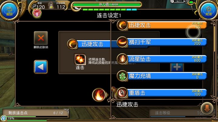 连击是本游戏战斗模式中的一大特点,当初由于我过于咸鱼,弄了一个多月才彻底弄明白连击的特性。所以我觉得有必要来此为萌新简洁的解释一下连击的属性特性。直接进入正题吧。这里我用单手剑的技能进行解析演示。1.连击特性连击中最简单的特性<连击>使用威力攻击后第一个框框内的迅捷攻击,这里可以看到它本来是100的蓝耗,但是有了<连击>,它的蓝耗就会变为0,从而本连击只会消耗1蓝(也就是100蓝/一格
