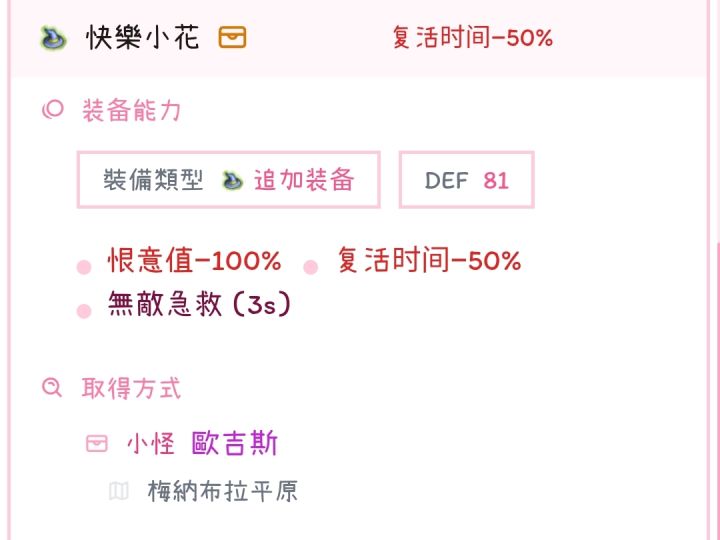 日常发癫的时候,再想如何提升我的电宝的上限然后逐步加码,堆了一堆东西然后发现有个很有意思的追加快乐小花,减百仇,减50复活时间然后整出这么个东西加上减15复活时间的时装就能到15秒复活了附上个人电宝加点