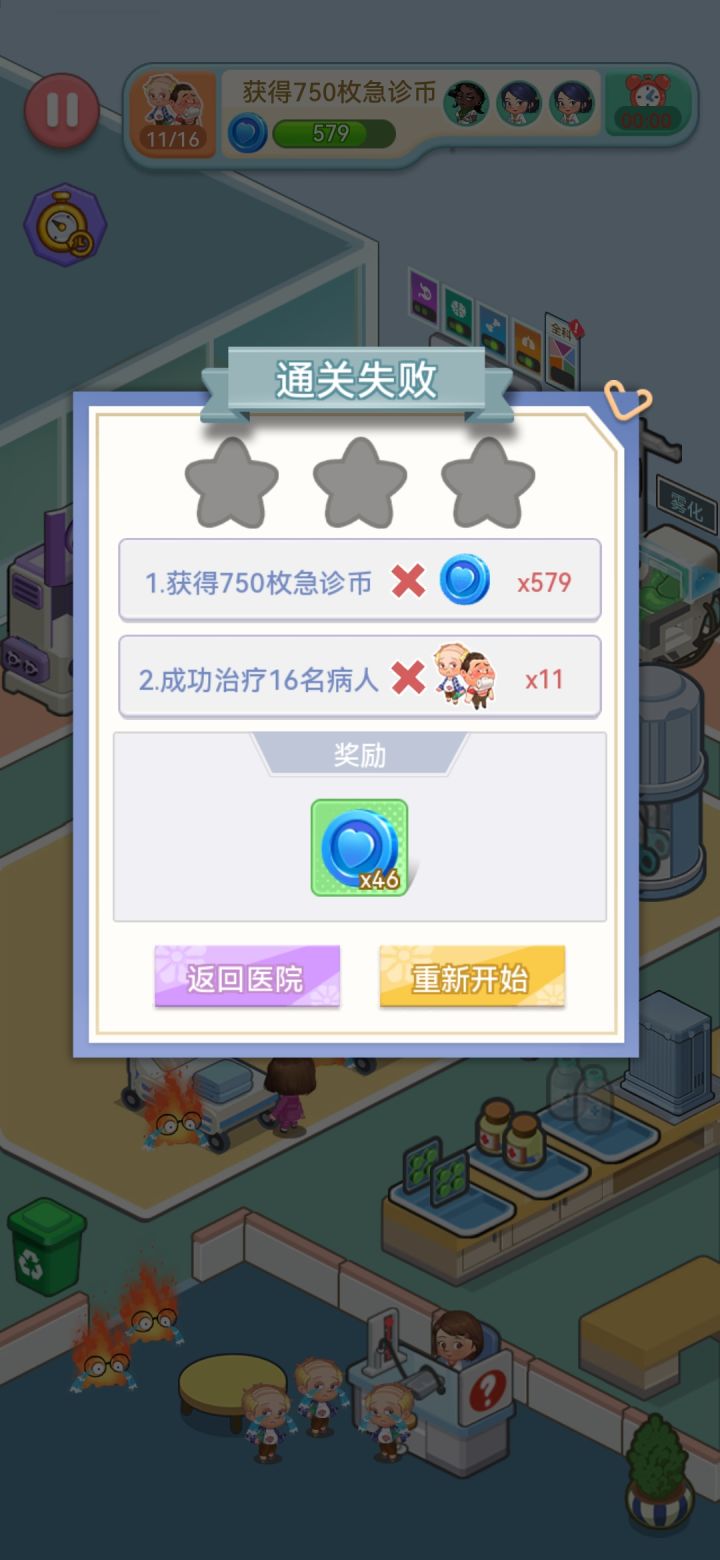 哪怕闯关失败,也应该把该关卡中实际获得的急诊币奖励给玩家。(图中过关目标是750个急诊币,我得了579个,实际才给我46个);失败了才只给几十个急诊币,太不合理了!