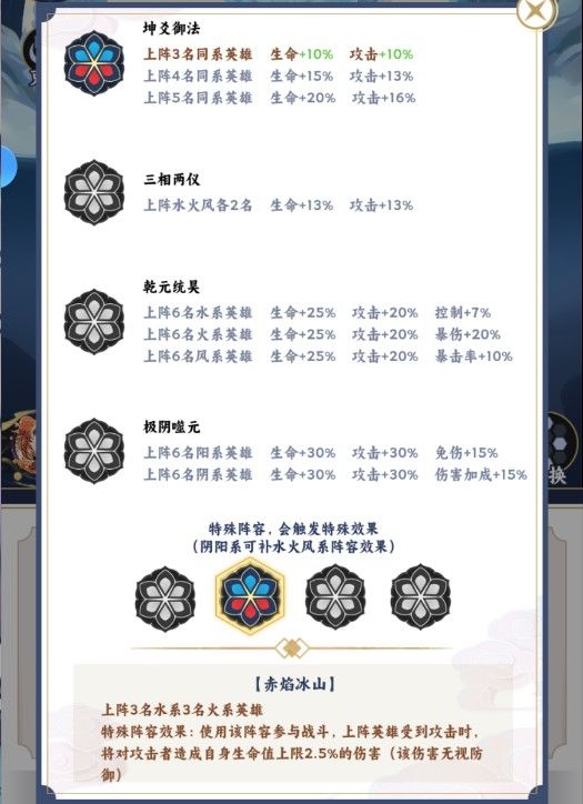 你游开服快一个月了,白嫖玩家基本也快一队全满13星了,进入选择阵容的阶段。这里为各位玩家推荐一个比较强力且好玩的阵容。废话不多说,先看羁绊图。如上图,羁绊效果是受到攻击会对攻击者造成无视防御的伤害且该伤害受属性克制加成,即克制增伤。(有疑问可自己随便组一个,去观察敌人掉血出现的伤害数字,属性克制和普通伤害字体颜色有区别)另外,阴阳系没有组成33阴阳的时候,是万能的三系羁绊替补。简单来说,3