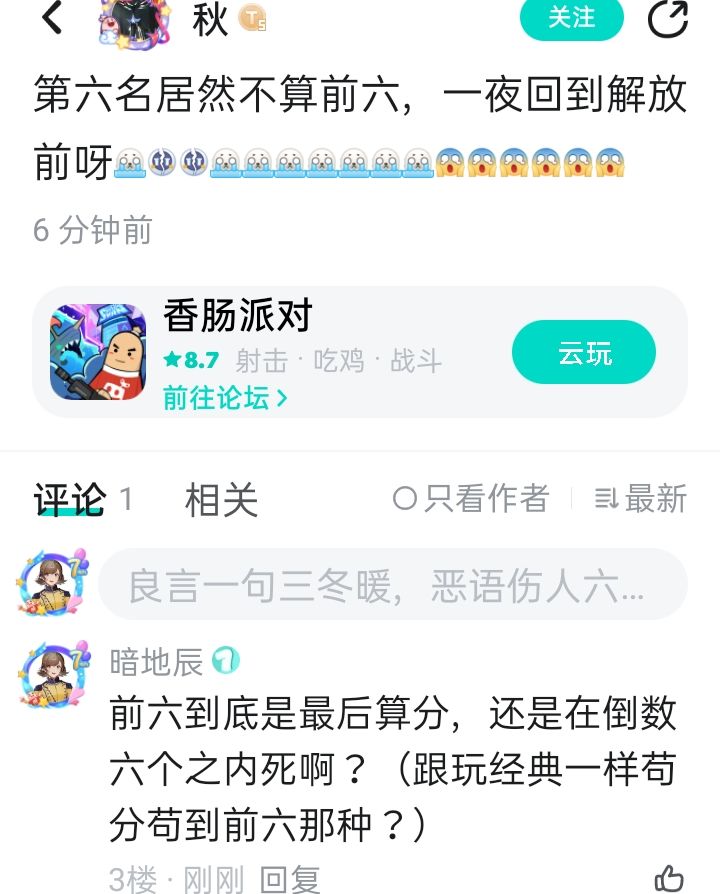 前六到底是最后算分,还是在倒数六个之内死啊?(跟玩经典一样苟分苟到前六那种?)#竞猜前六 #smc