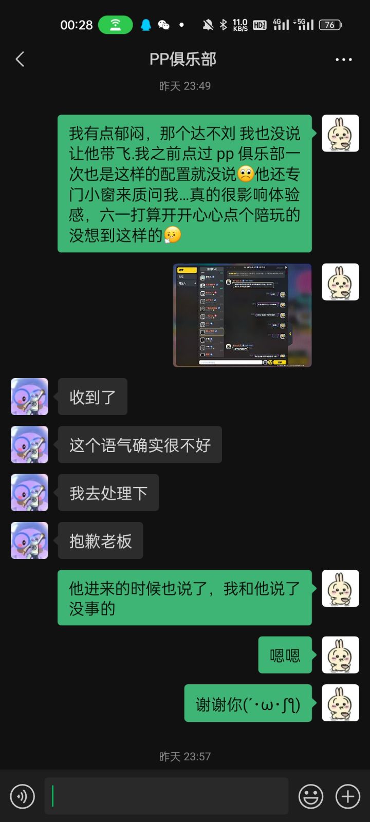 没想到六一是这样结束——(纯吐槽)不过现在心情好多了想着六一和朋友一起开开心心的打游戏就去点了个技术陪没想到一进来看我们是三个女生就给我们甩脸色(真的很离谱)后面私聊我还这么说语气真的很冲…主要是他打的也不厉害都四排了也不和我们交流就自己一个人莽…后面我让他和我妹朋友打双排结果也是打得非常拉垮以 33/50 结束了游戏并火速下线(我妹朋友口述的) 超级