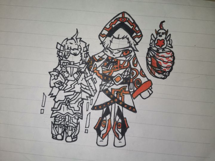 耶梦加得:原型是一条巨蛇,加入类似于炼金术中的衔尾蛇元素,发型和手部有着古老的北欧文字刻画,脖子上带着衔尾蛇项链,眼睛为蛇瞳,衣服上有类似鳞片的质感,背部有未成形的翅膀,腿上画满了炼金法阵。配色:红白(感觉就这两个颜色合适一点)芬里尔(芬格丽薇尔):原型为吞噬奥丁的巨狼,手上脚上缠着些许锁链,白色的、毛绒的衣服上挂着些许冰渣,脚部是由冰块组成的狼爪左肩有一颗狼头,类似于侵蚀一般的蓝色纹路蔓延在