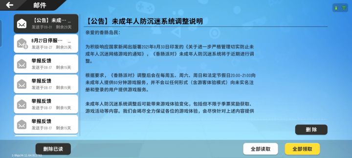 现在所有网络游戏都玩不了了,这个香肠派对超过一半都是未成年玩家。腾讯游戏玩不了我认了现在连所有网络游戏都要进行健康管理,我只能选择破解版植物大战僵尸了😞,香肠派对虽然我的没有健康限制但是也没时间玩,趁现在香肠派对还没有人脸识别重新创号吧😄(S686请绕道)最后再说一遍未成年防沉迷是国家规定的,对未严格落实的网络游戏企业,依法依规严肃处理。🙄