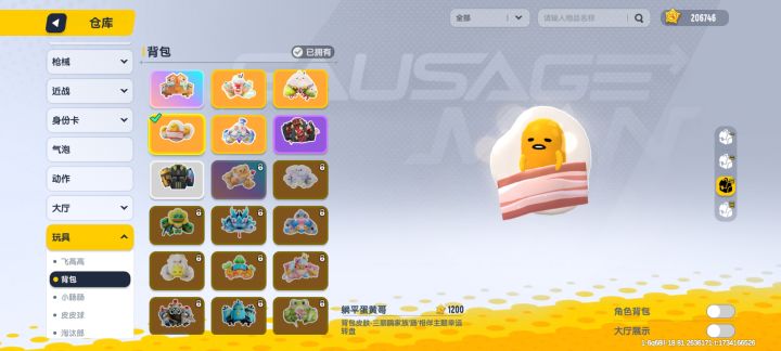 其实在我看来香肠能被称为“真神”的背包皮只有一个…就是和三丽鸥联动的“躺平蛋黄哥”其他的背包皮三级包和四级包都只是换了个色(甚至两个梦幻也是)而蛋黄哥就不一样了…是目前唯一一个全背包改模皮仅这一点还不能被称为“真神”…?