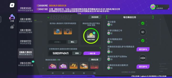 点击活动–在火爆界面–点击肠肠大集结–在图片画圈⭕处输入“5URQVPDZFG9W ”–即可领取两个金色装备。 #香肠派对手游