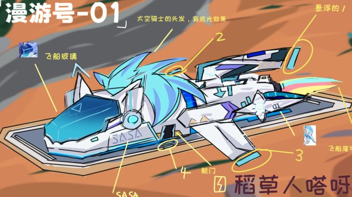 以太空骑士为原型的设计的飞船,名字是根据宇宙漫游纪这个赛季名起的,编号01号(我一个女生画有点小酷的飞船,不过分吧?)这个点发有人看吗?讲解图:方便看的图:原型:正式服ID:8u7fdr昵称:稻草人嗒呀丶我突然发现自己总是喜欢在投稿第一天就画完( )