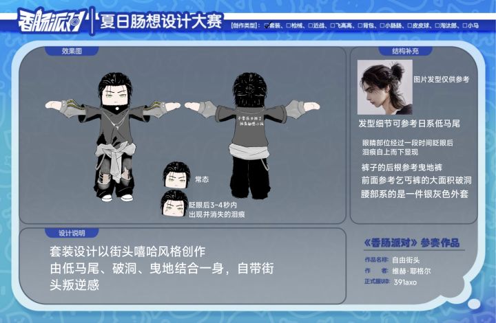 正式服ID:391axo作者:维赫·耶格尔设计作品名称:自由街头皮肤类型:套装设计灵感;街头嘻哈#香肠派对第四届设计大赛 #香肠派对