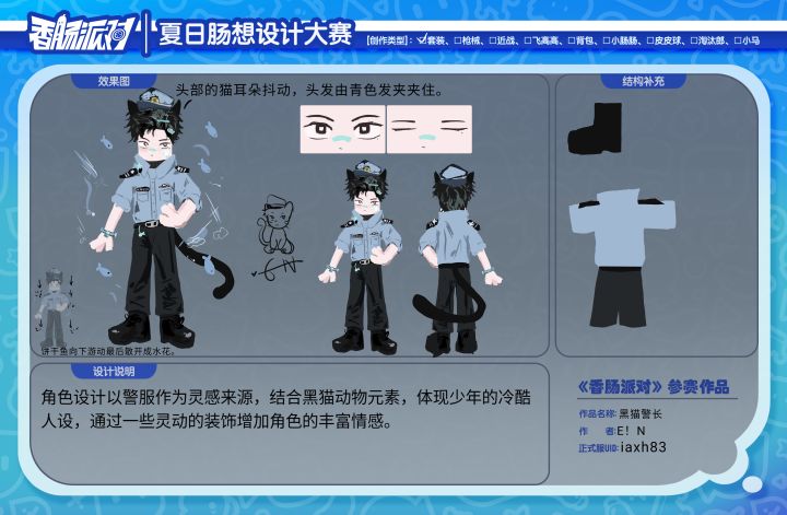 正式服ID:iaxh83作者:E!N设计作品名称:黑猫警长皮肤类型:套装设计灵感:角色设计以警服作为灵感来源,结合黑猫动物元素,体现少年的冷库人设,通过一些灵动的装饰增加角色的丰富情感。#香肠派对第四届设计大赛