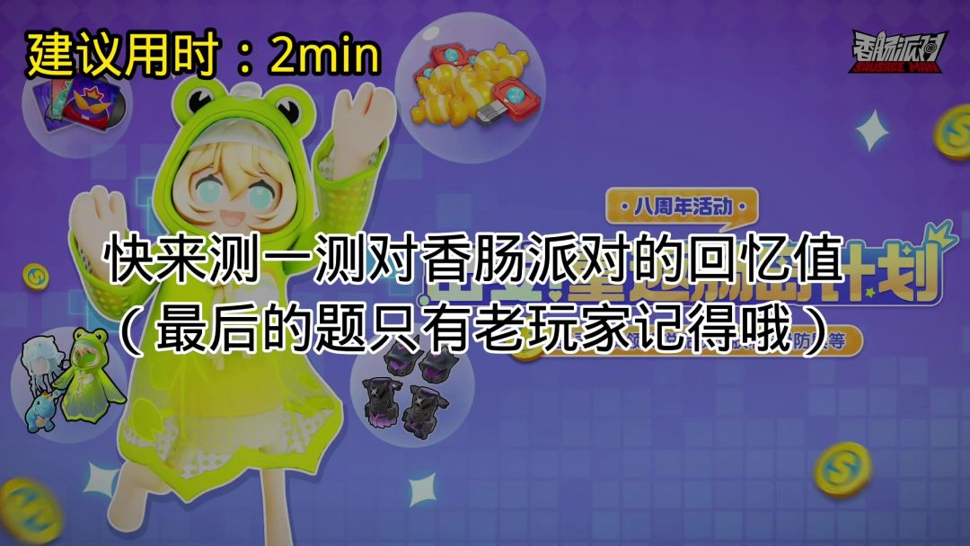 转眼间,香肠派对已经陪我们走过8年,你说8年是2920次日生月落,最开始玩香肠派对时,段位低,也没什么皮肤,你,是我第一个好友,曾经我们一起双排,一起在彩虹岛沐浴阳光,可是,现在的你,早已退游,如今的我不缺皮肤不缺段位,可再也没有你了…香肠派对八周年快乐,致香肠派对小黄熊主播,小小歪主播,致香肠派对! #香肠派对八周年创作征集令 正式服id:l3umgo