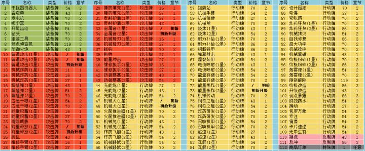 摸了很久才摸机械师卡牌的商店价格一览(超大图预警)卡牌售价以噩梦6(含)以上为基准,噩梦6之下价格约便宜8%,向上取整。机械师卡牌的商店售价档位从11、16、27、43、54、70、86、119进行递增。其中,价格≦43的可以在任意章节出现,称为“一章卡”;价格54至70的,只在二三章出现,称为“二章卡”。价格≧86的,只在三章出现,称为“三章卡”。由于增殖弹(2星)、能量释放(2星)、弹药
