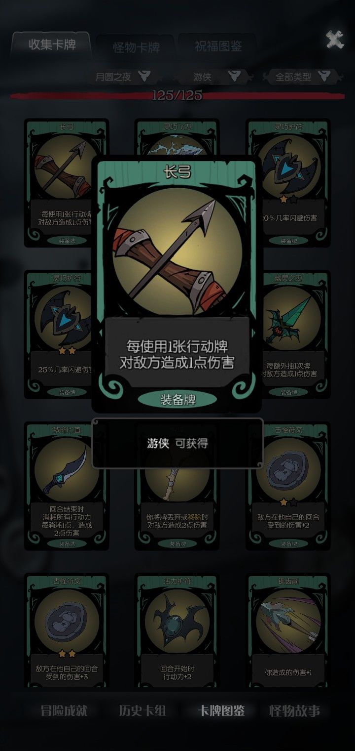 今天玩了一下午,总算把佯攻给整出来了,不容易啊!嗯,怎么说呢,想刷佯攻,还是很看运气的。佯攻,在最新的版本里,是一张0费的行动牌,虽然是一张怪物卡牌,但好像没有怪物有。(刷了几次古堡窃贼,没见他用过)所以,想要点亮图鉴,需要我们把佯攻送给怪物,并让他们使用。思路如上,具体流程如下:1.我们要开一局游戏,职业为游侠,开启附加模式,难度选择普通难度就可以了。2.必须凑齐拓印与伺机而动这两张