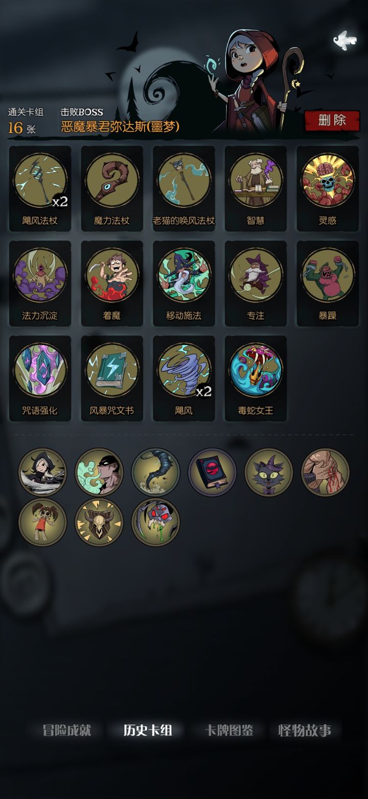 通关牌组分享飓风通关(纯粹爱好,不要杠。)牌组分析(重开也是游戏的一部分不要强求)核心祝福 龙卷风 吸血魔典龙卷风配合飓风法杖保证法力和伤害(游戏有权重保护,牌组不是很杂的话不难拿到)吸血魔典,保证生命值提高回复(真 随缘,可以使用一切可以提高生存率,牌和祝福,不要太多会影响牌组权重。)核心卡飓风法杖造成2点伤害恢复1点法力值(有一个复制强效武器的负面效果是,使用过的牌变成爪,那就不