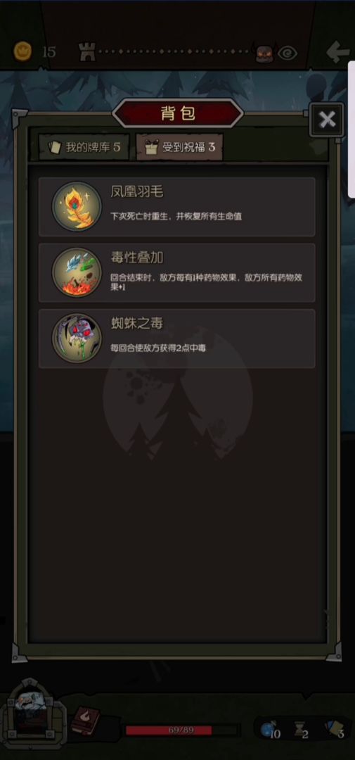 前言:提供简单又极限的打法,向运气游戏说不!本攻略如果有人学会了,可以在本帖回复发一下以此打出来的通关卡组,让大家看一下效果。正文整装待发:打法思路:用缝合怪可以获得固定3祝福(2普1稀),这里我们选择毒性叠加+蜘蛛之毒+凤凰羽毛。蜘蛛之毒配合鸡尾酒的冰、火、粘,每次毒性叠加都可以给每个BUFF加4层,注意到毒的累加性,每个回合能加6层,配合冰、粘的控制效果,这在前中期是十分可观的,怪物