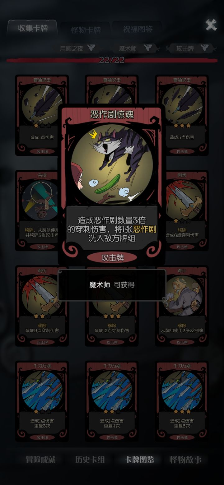 新版一张卡带起了魔术师恶作剧流的崛起,非常强势,话不多说直接上货!核心key牌:恶作剧惊魂,这张卡一定要在第一章拿到 很大几率会引导出恶作剧,恶作剧一二三章都有可能出,惊魂作为主输出卡优先拿取。核心key卡2:恶作剧,这卡配合惊魂使用 快速打出控制和输出 保证怪在接下来的回合对你伤害减弱以上两张卡牌尽量只各拿一张 欧皇自行忽略 但是其他攻击卡一定一定不能拿 基础攻击牌也要尽量在三章前删干净