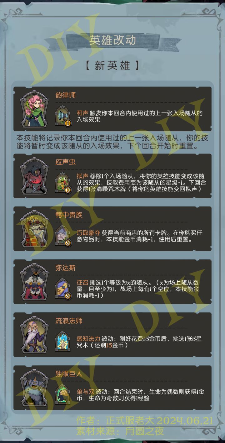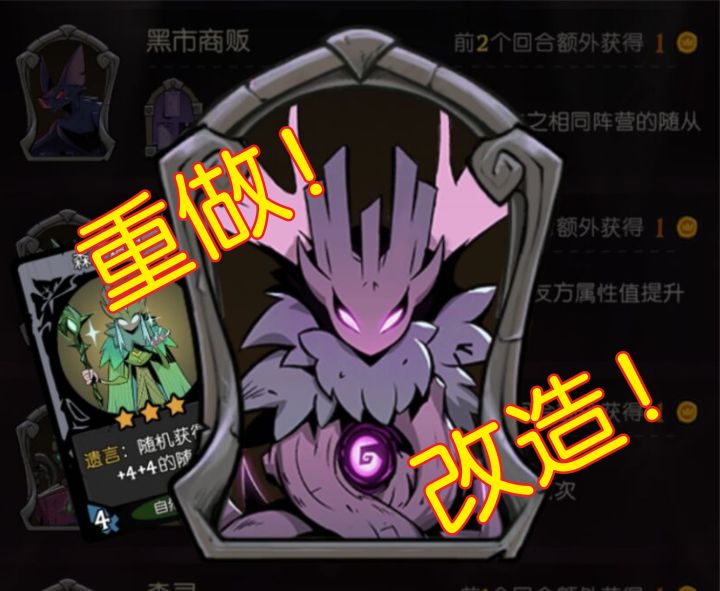 虚空族属性:虚空族只能和本体三连,且不可被复制。虚空族的三连奖励改为获得一张当前商店等级的虚空族随从(无法是虚空之主)。特性:虚化(无法使用装备,随从受到的伤害减半,且减伤效果不会叠加)随从:虚空之主6⭐️,虚化,法障(咒术牌和角色技能触发的效果无法对该随从有影响,包括使用奖券无法找到虚空之主,或者是任何增益减益的咒术和技能),属性:10/X(X为本局召唤过的虚空族随从×6)入场:移除你