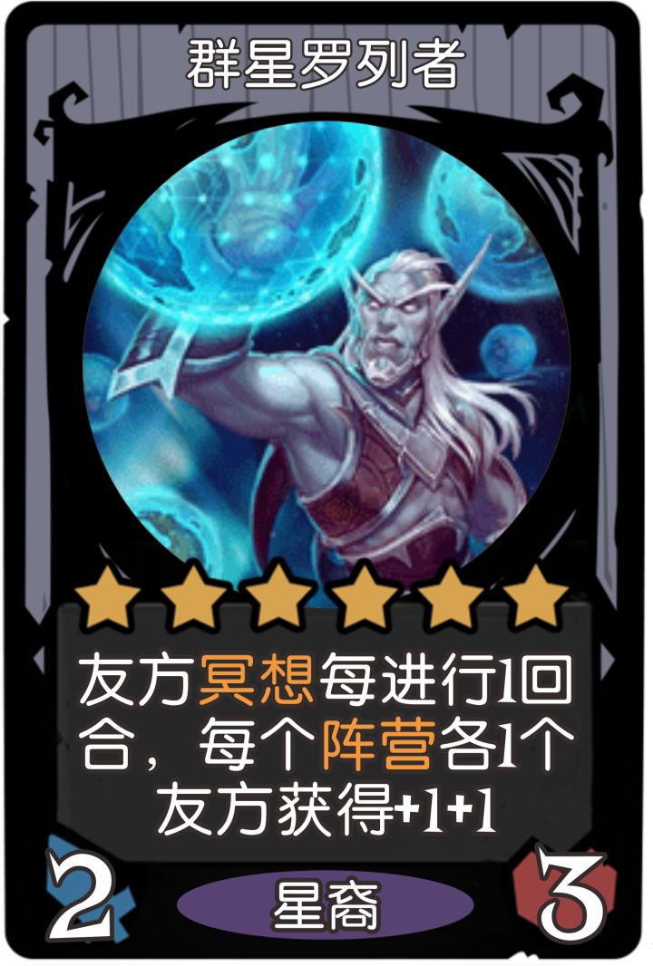 【吞噬星座】另一种无限冥想的表现方式,冥想结束后回手,再次打出便可重复冥想。配合【冥思者】(触发冥想+2+3)和【星轨测绘师】(触发冥想+1经验),能够稳定提供冥想收益。在后期,更是可以与【摩羯之影】和【黑夜行者】实现战力“倒转”,但是这种“倒转”只能起到辅助作用,因为只利用了【吞噬星座】回手的机制,其自身是无法带来属性提升的,所以总体上是比不过现在的资源倒转的。因为回手的机制,决定了他不能提供资