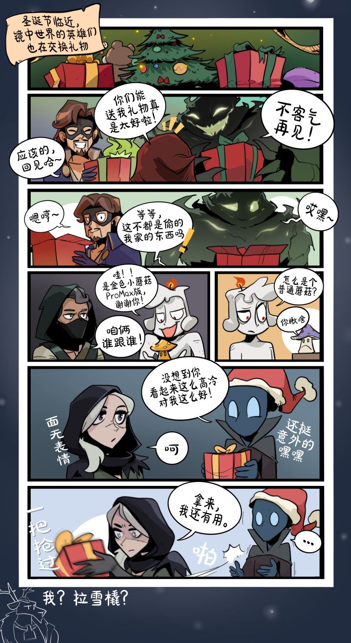 圣诞节临近,镜中世界的英雄们也在交换礼物 蜡烛人:哇,是金色小蘑菇ProMax版,谢谢你! 窃灯人:咱俩谁跟谁! 热闹使用技能ing....... 感谢社区画手床下的霍格 的精彩创作 #月圆之夜奇遇爱丽丝 #月圆之夜 #月圆轶事