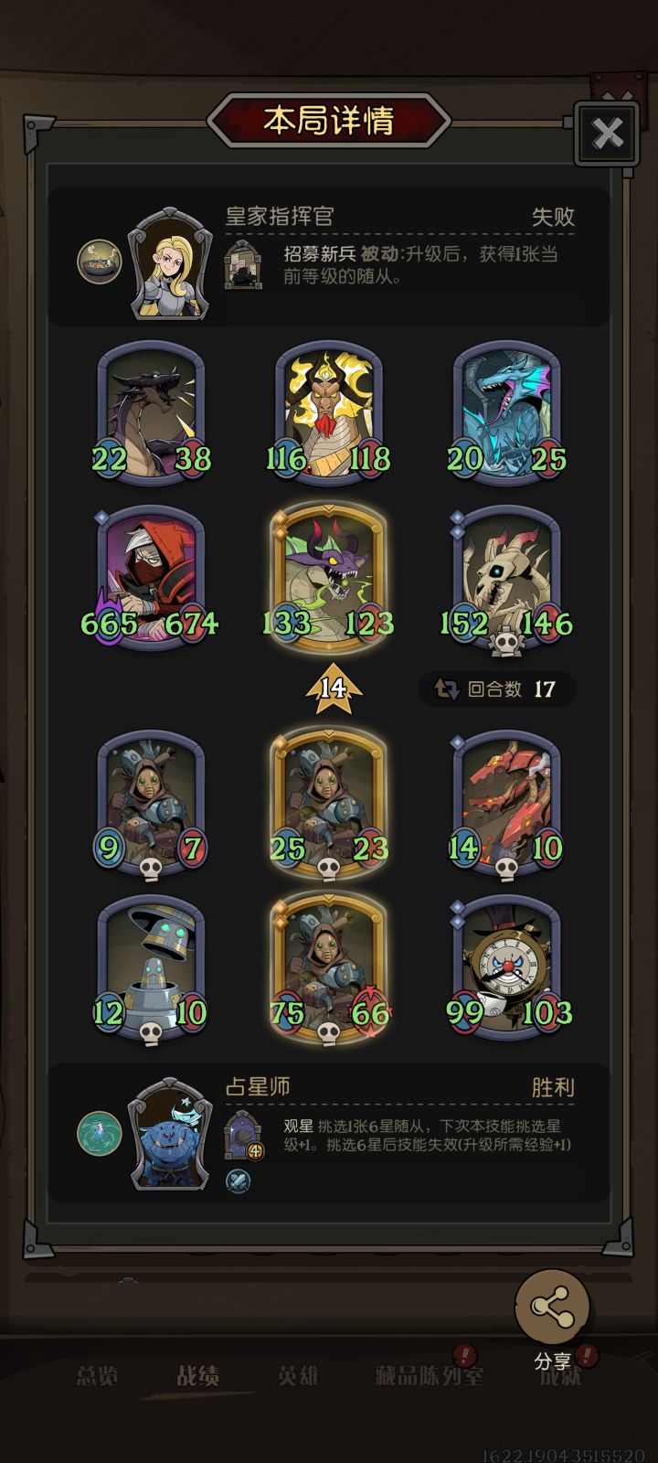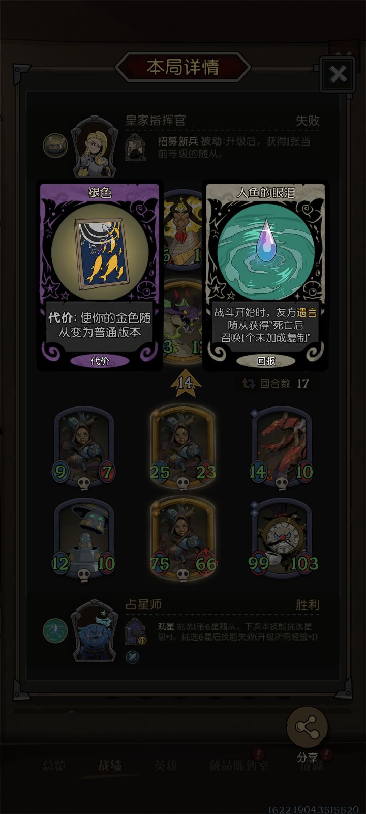 改版后的宝藏完全适配机械遗言,尤其3费拾荒者现在直接召唤复制,而非原始复制:金色死了召唤金色像这局,对面转了个大刺客,刺客能打掉遗言(骷髅头图标),但是打不掉死后召唤(墓碑图标),死后召唤的随从遗言还在,尤其还是金色,能再召唤一个200多身材小怪总之改版后机械遗言如果不暴毙,就非常能叠尤其机械眼调整到3费,其实对搜牌也有帮助前期拿3费炸20和拾荒,还是有强度,贴机械眼,4费找召唤给钱,能
