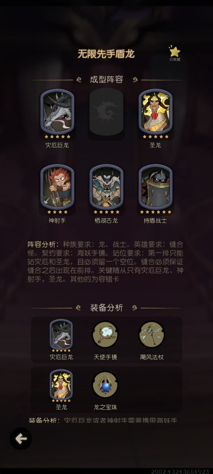 种族要求:龙英雄要求:缝合怪契约要求:海妖手镜站位要求:第一排只能上两个随从。必须保证灾厄巨龙和神射手缝合之后在第一排,必须保证圣龙在第一排。关键随从只有灾厄巨龙,圣龙,神射手。栖湖古龙和持盾战士用于提升容错。持盾战士可以使用天使手镜替代,除非圣龙有阵亡风险(比如对方有先手伤害,亡语伤害等。或者为自然、盾战这种有反击伤害的),其他情况下均为天使手镜>持盾战士。推荐装备:灾厄巨龙:飓