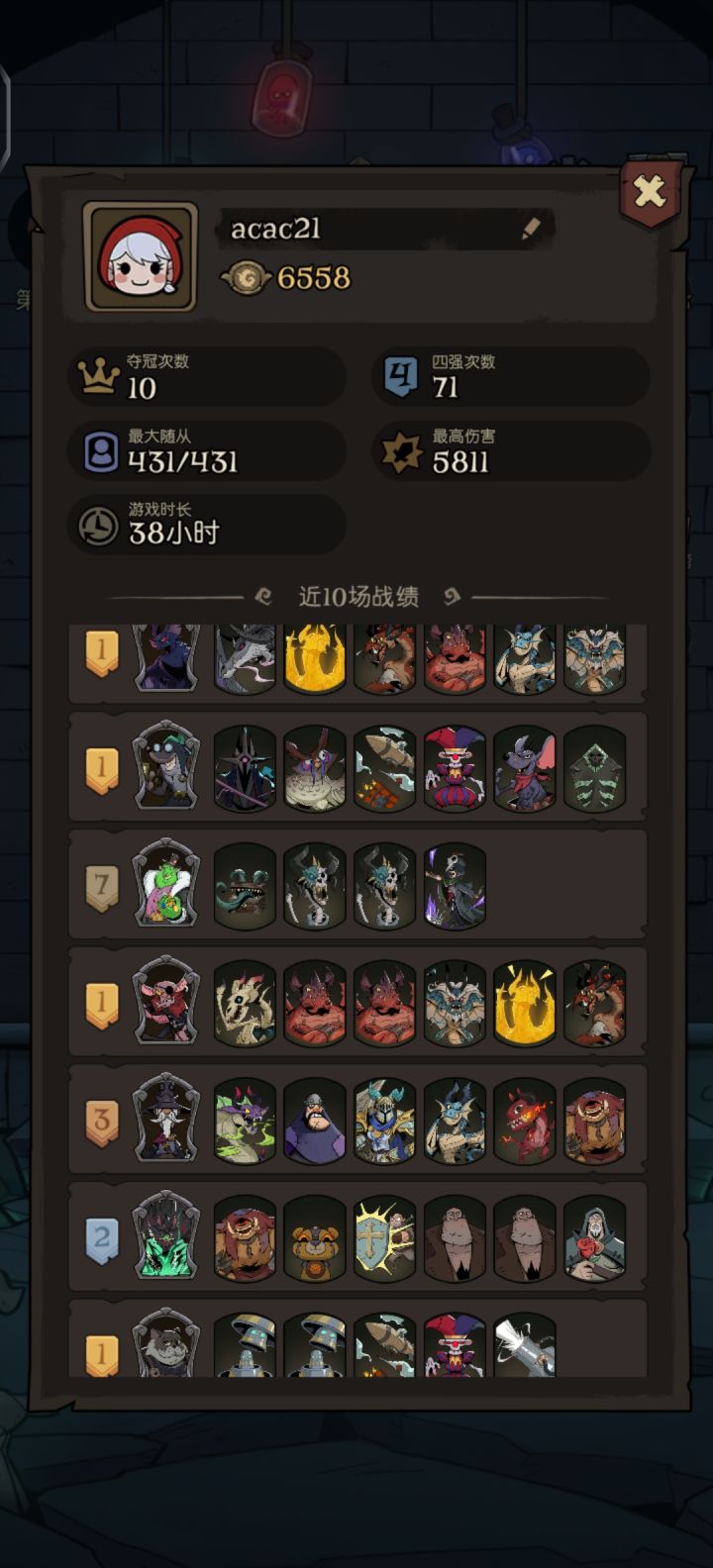 最近联机各种阵容玩的飞起,最强的感觉还是套娃+飞艇+飞艇+傀儡师+大老鼠(超过十场了截图没记录),套娃里面套了n层,白色金色套娃都有,最里面的是魔女。那阵容真的打谁都不怕,死一个,套娃瞬间又灌满所有位置,出来的魔女个数都数不清了,只要轮到我出手(都是飞艇遗言,死完了还是我的回合),必把你随从消耗光