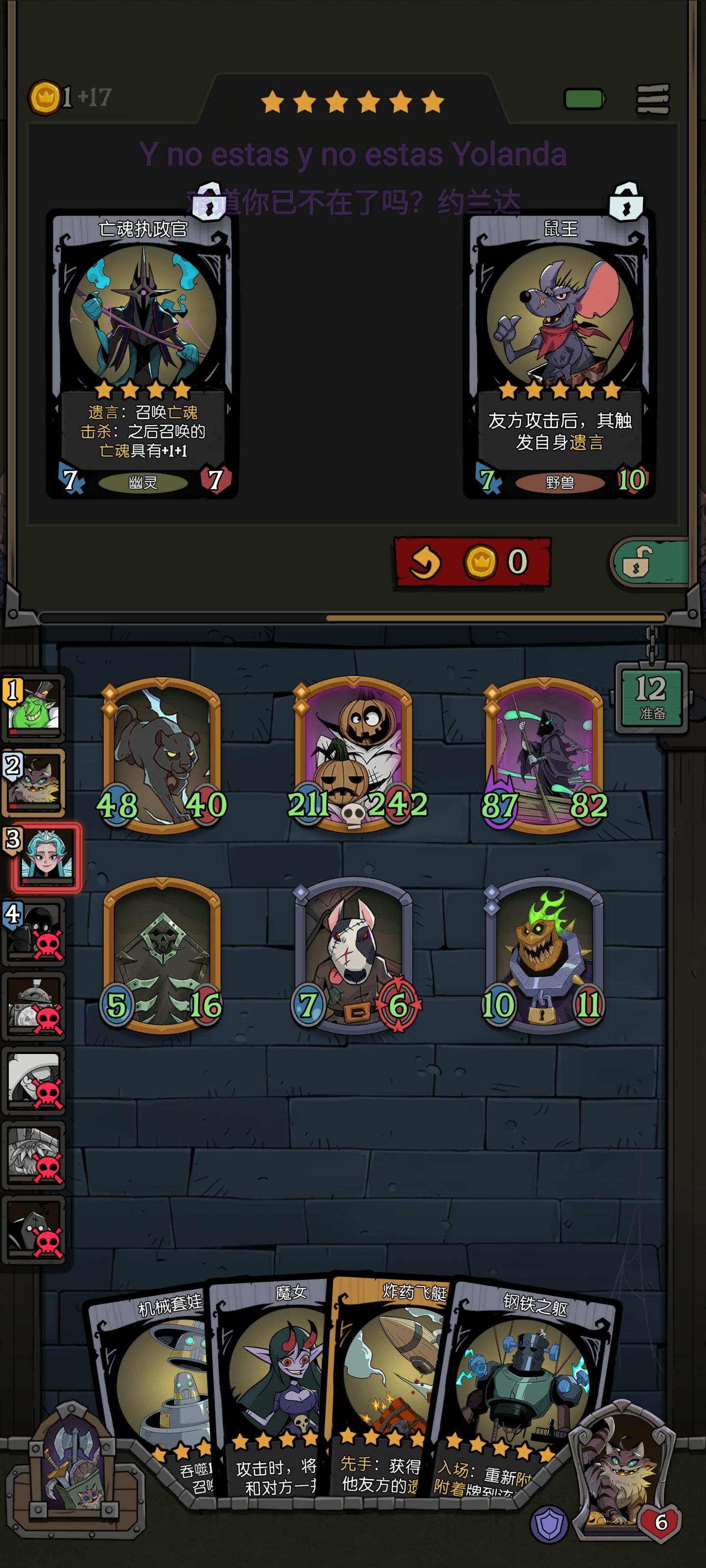 先说卡牌技能异国刺客:对所有随从造成1点伤害,金2次先手飞艇:获得同排友方遗言(拿异国刺客的遗言),金2次黑玫瑰,受伤给同排友方遗言3点伤害一次(挨队友打给他遗言)下面就是老鼠(感觉可以换,但不知道换啥),毒蛇,傀儡装备方面的话异国刺客:寒冰咒文书(5星,受到伤害-3攻击)先手的话就是1x2x3x2x2,24次,降低敌方全体72点攻击朴素法袍(4星,造成2次伤害+1+1)24x3,