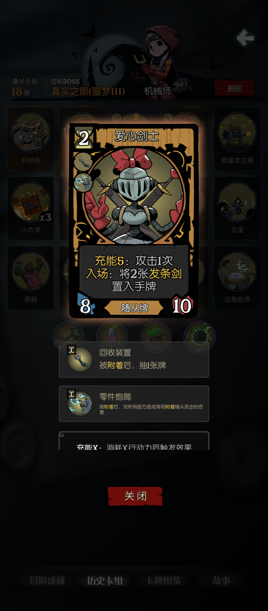 1.核心卡牌:【死亡钟摆】+【死亡乐章】。 2.核心祝福:无。 3.原理:【死神降临】叠审判,审判洗【死神降临】,只要洗死神的数量a×单次死神叠的次数b≥10就能永动。 4.重要卡牌:【死亡怀表】(过牌+瞬间叠10审判)+【斜掠】(配合乐章减少核心卡牌数量需求)。 5.重要祝福:【死神硬币】(让【死亡怀表】100%叠10审判,并且可以喂牌给孢子和蜗牛)+【前世记忆】(免受【死神降临】对生命的消耗)。 6.其他:打【森灵】最好用1乐章+5钟摆,卡2×5=10来达到永动的要求,这样卡组数量能维持在一定范围以免触发【森灵】腐化效果时变出太多【爪击】。