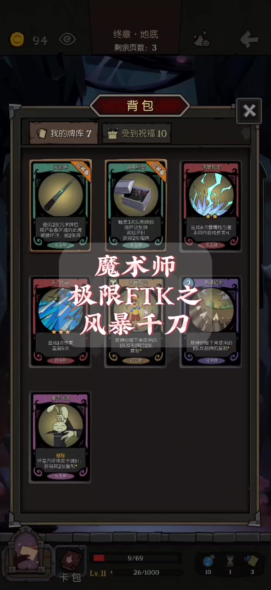 小女巫 噩梦ftk森林之心① 核心装备:魔力法杖(有就拿)、飓风法杖 核心卡牌:1)咒术加倍类卡牌 eg:行动牌:叉状闪电、咒术强化 法力牌:法力膨胀 2)叠加法力类卡牌 eg:法力牌:法力沉淀 咒术牌:风暴咒文书 3)输出牌 eg:法力牌:飓风(一张足以) 核心天赋:卡牌图册(普通) 魔力交叉(稀有)、龙卷风(稀有) 灾厄之力(潘多拉)② 血量:血量随便减,后期不扣血 法力:尽可能通过拿牌或者喝女巫药水等方式叠加 行动力:2(推荐) 还有不清楚的可以问我。