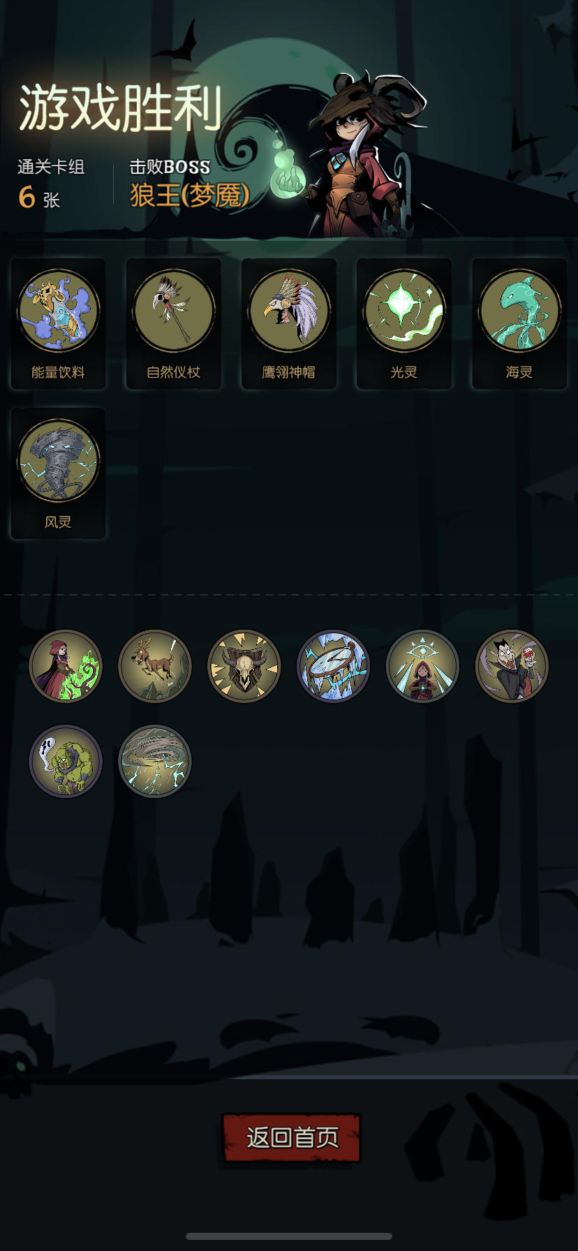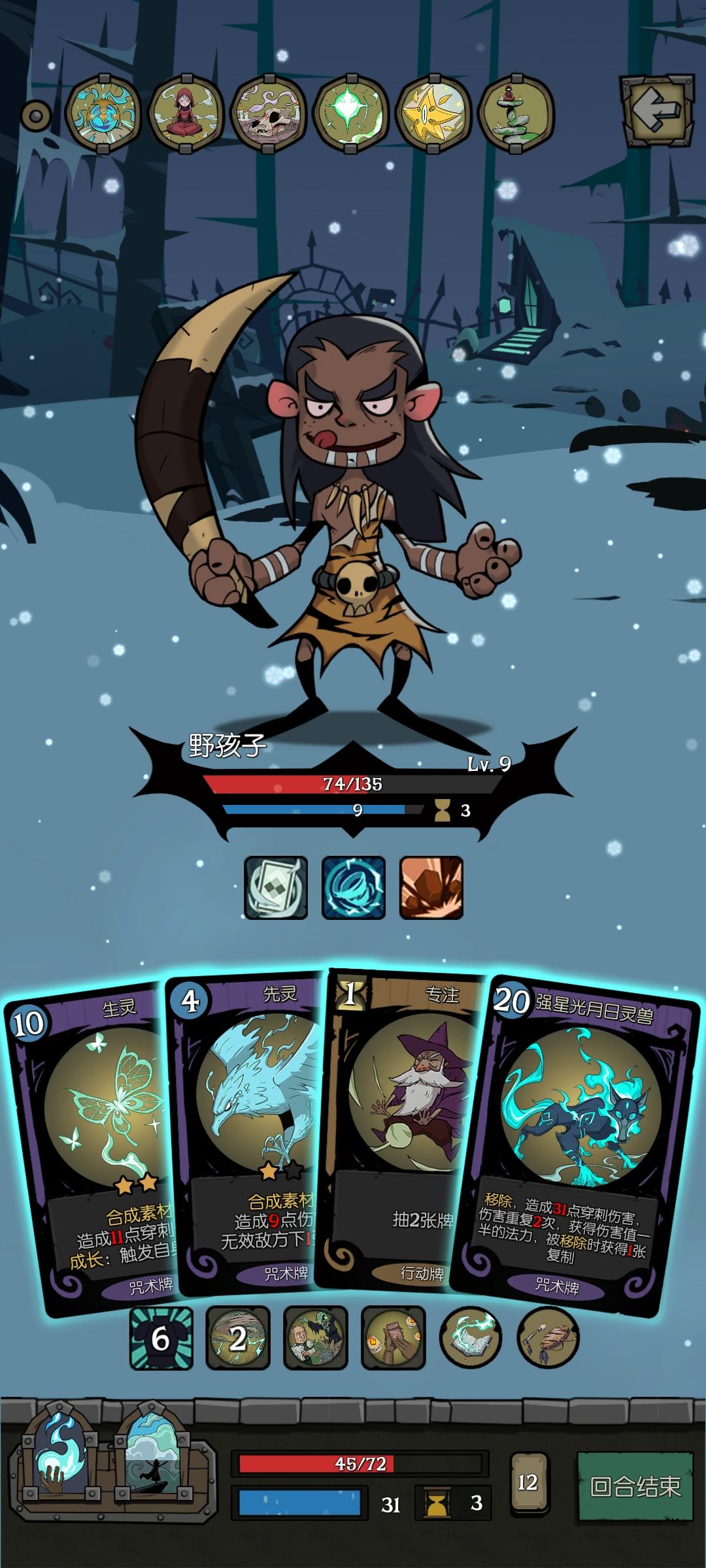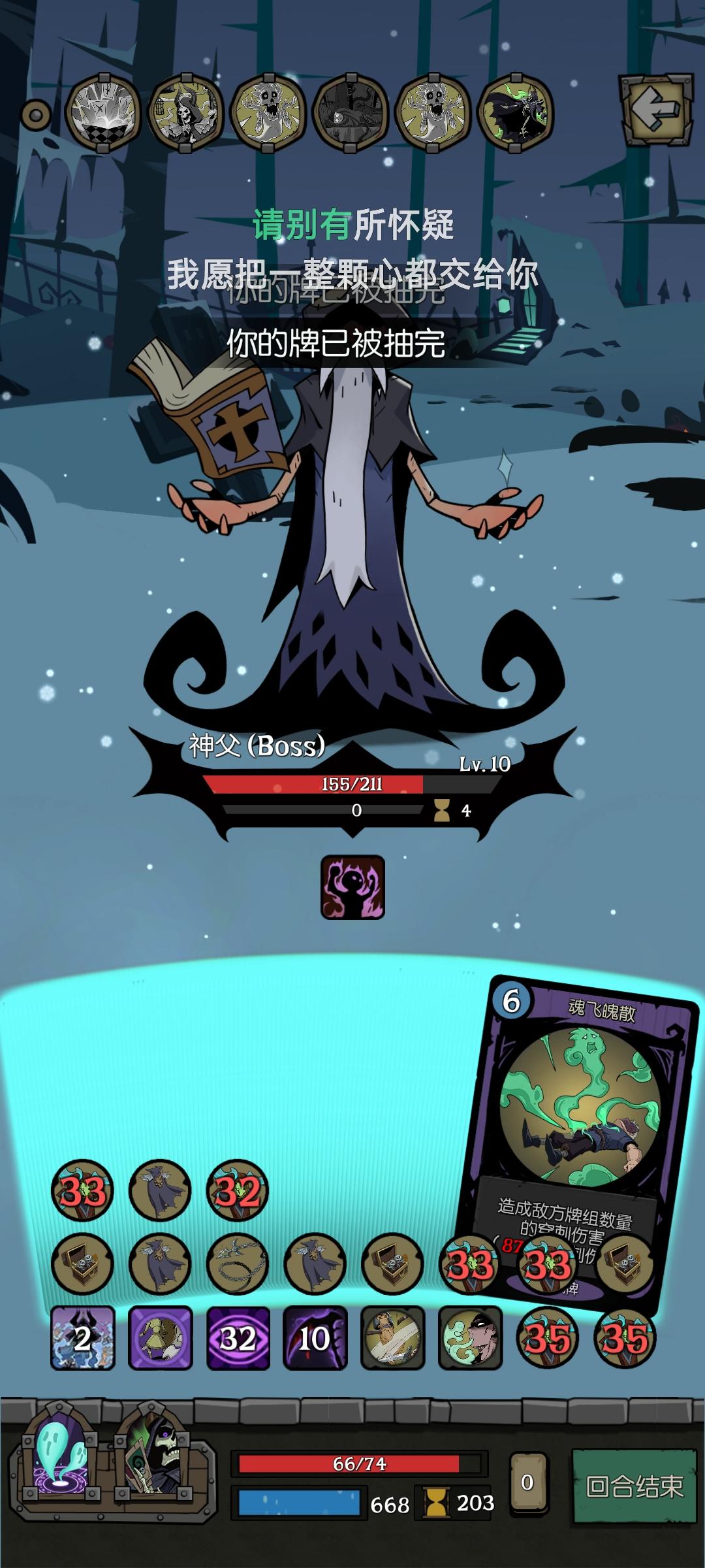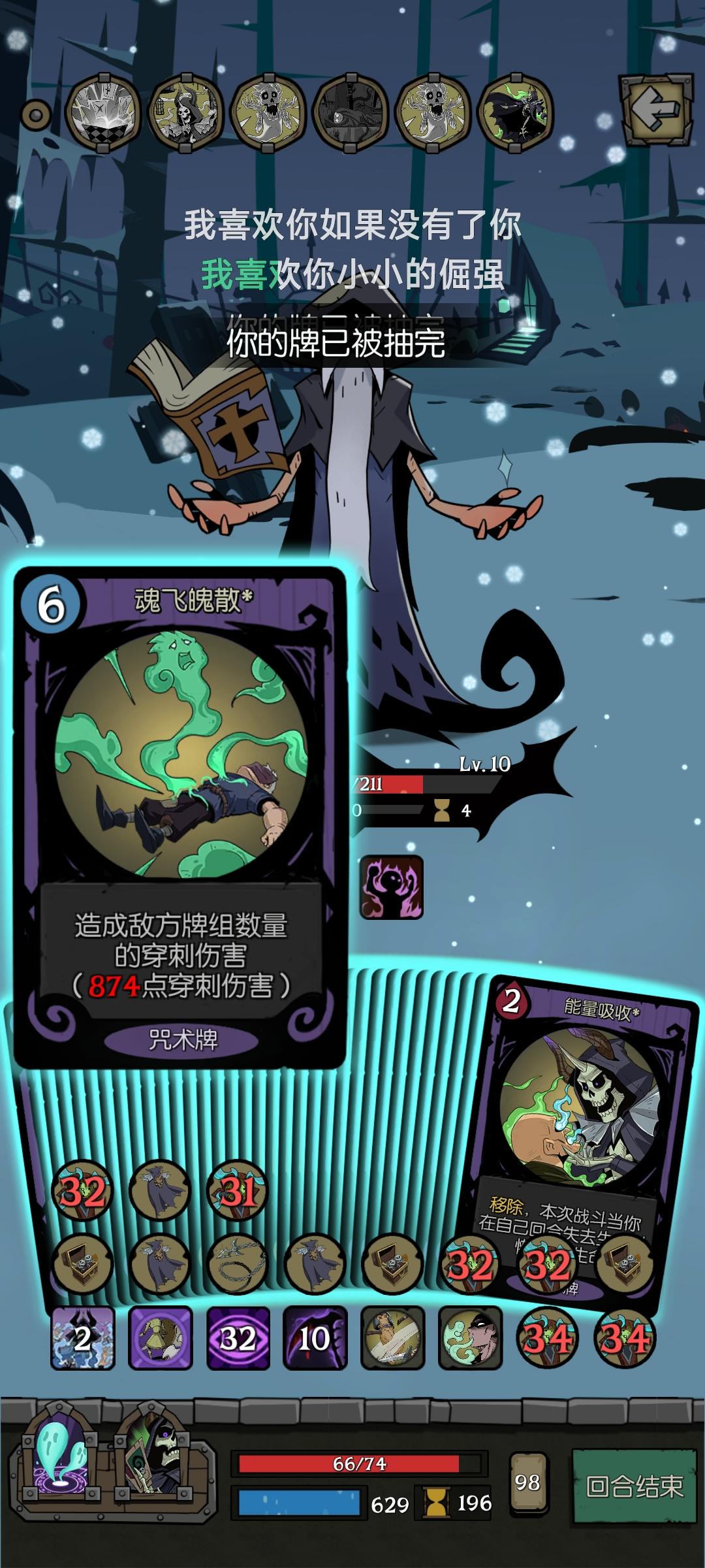 OK我终于过了这关了啊,也是卡了我好久的关卡,主要打法思路就三点,加血、掉血和回血——生命上限(100点生命左右就可以了)>装备栏位置>基础法力值就是至少两张魂灯(最好再搞一个能量吸收,然后多搞装备栏位置,至少留一个行动点给几张行动卡牌,最后就疯狂的扔牌吧