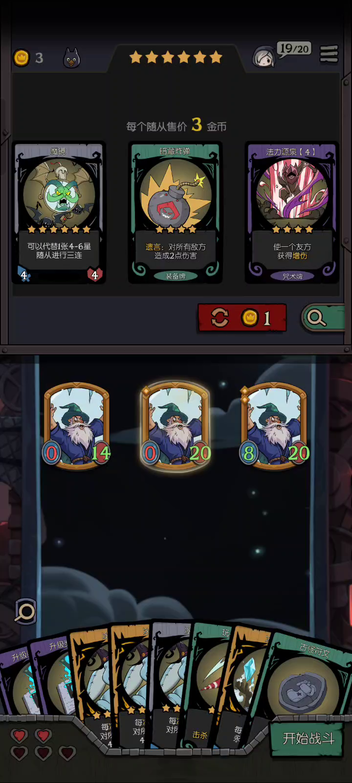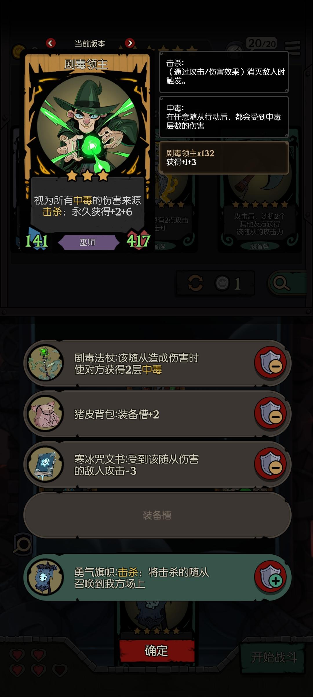 新版本刚开始玩,无意中发现的可以无限刷增伤药剂,增伤起来了,阵容卡牌装备什么的都不重要了,唯一要考虑的就是减少输出让怪物死慢点,可能多刷几回合增伤药剂。由于中期才开始刷,到打最终BOSS也才刷了100多增伤。 方法: 一、必备:封存 祝福、永久增伤药剂、随从 智者。 二、输出随从: 冰霜格雷特 、冰犸猪 ,装备:女巫扫把、雪球法杖等任意主动攻击型装备,增伤起来后,装备也不重要。 具体步骤:开局先