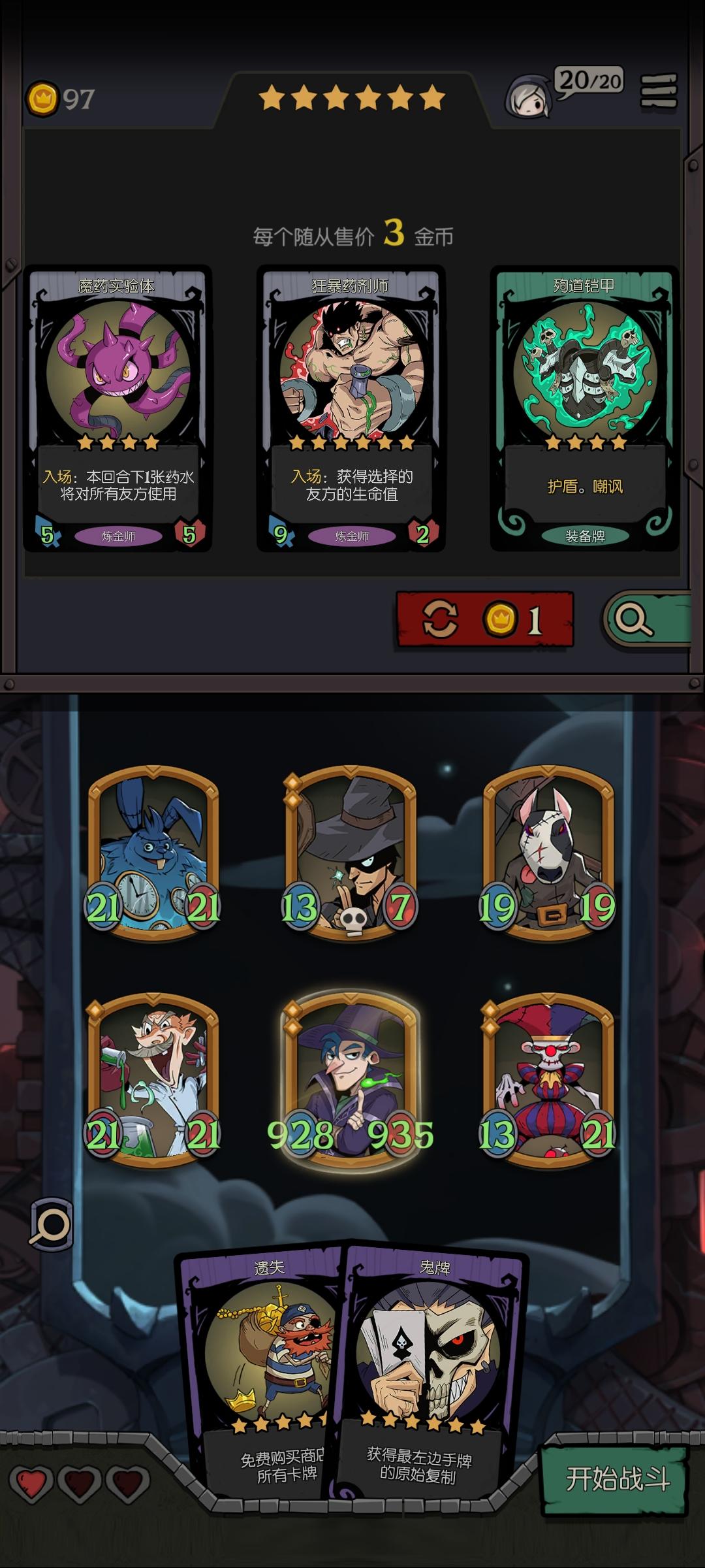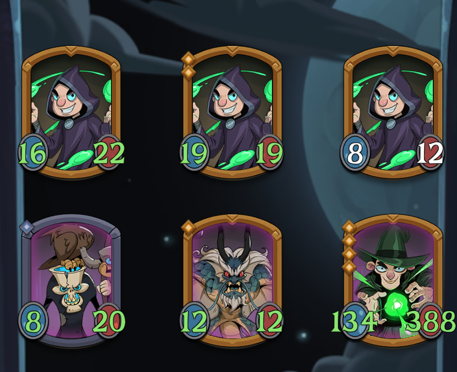 这个流派实在过于难过度,前面太容易崩了,这是我打出来最理想的一套阵容了。我认为这六个基本不能再替代了,装备胡的话,那个死后加4经验的巫师牌,一个先手触发遗言,一个遗言次数翻倍,加上遗言师次数加三,一回合能连升2~3级,炼金师准备阶段触发两次入场牌,加上入场效果加3的狗头人和降一级每回合多拿4元,一回合下来可以加20元,后面钱根本用不完了。