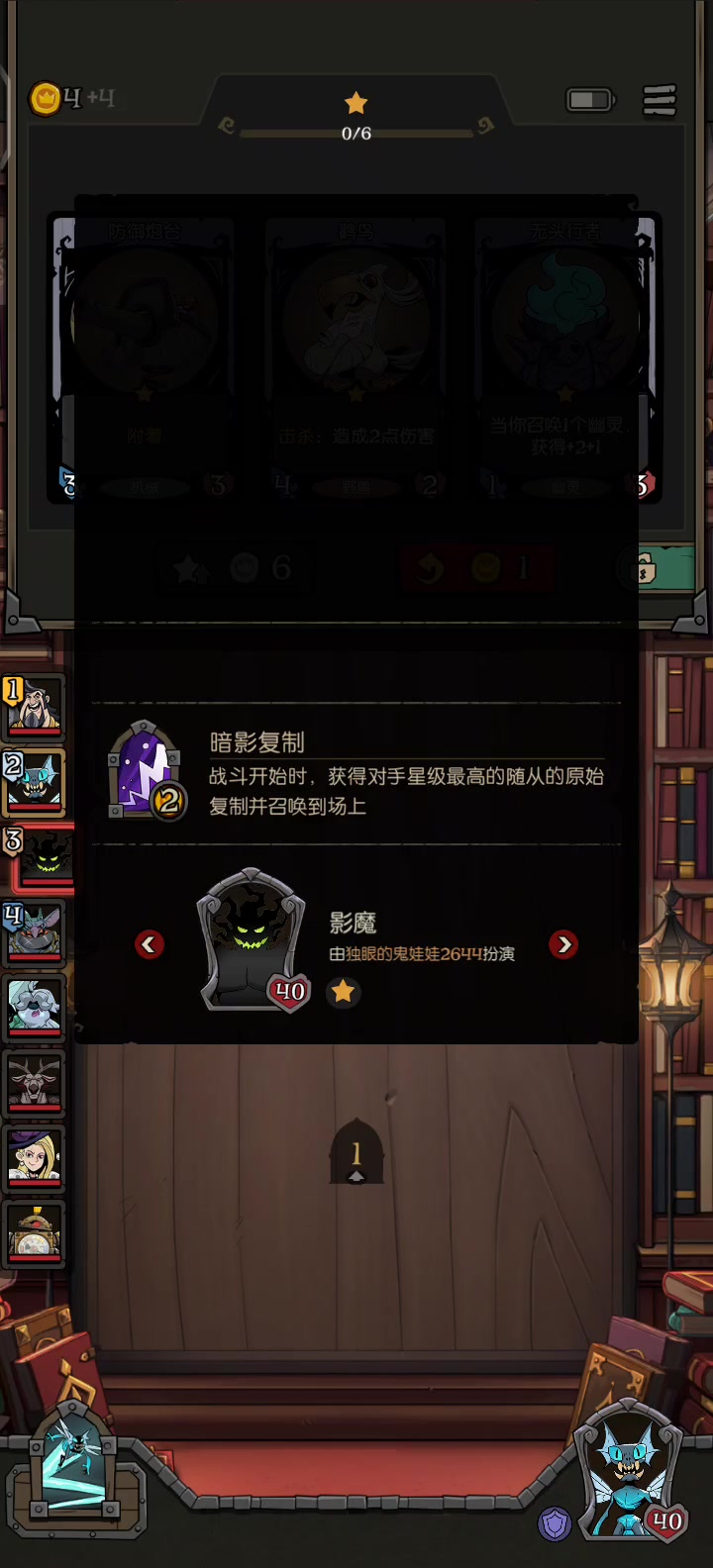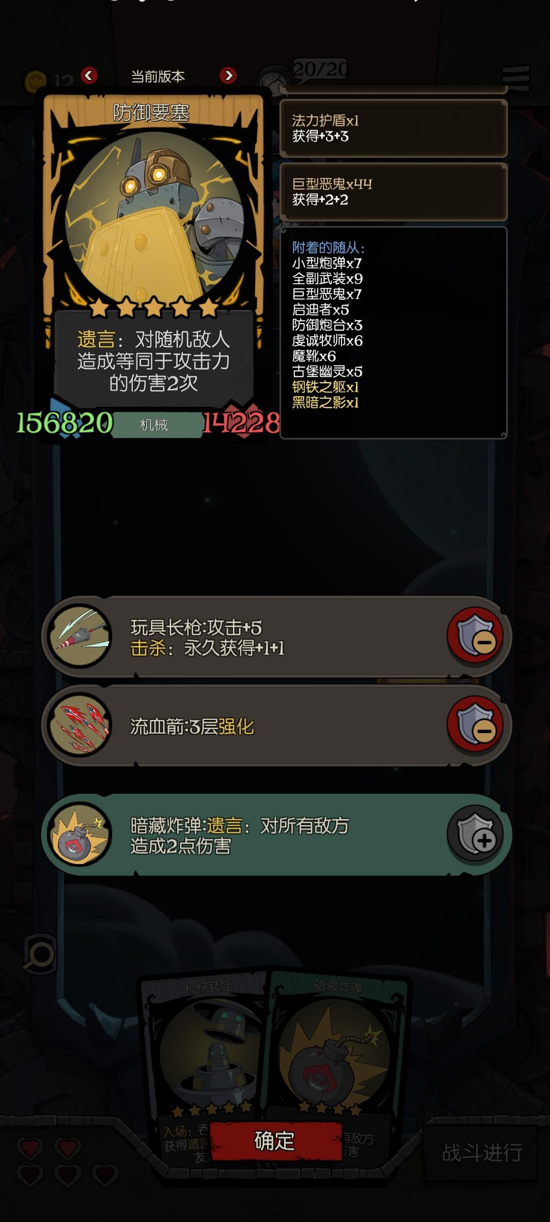 附着商店合成的黑暗之影(先手:附着第一位随从)附着→古堡幽灵(获得属性翻倍)附着→钢铁之躯(入场:重新附着用过的附着牌到自己身上)达成的指数级属性