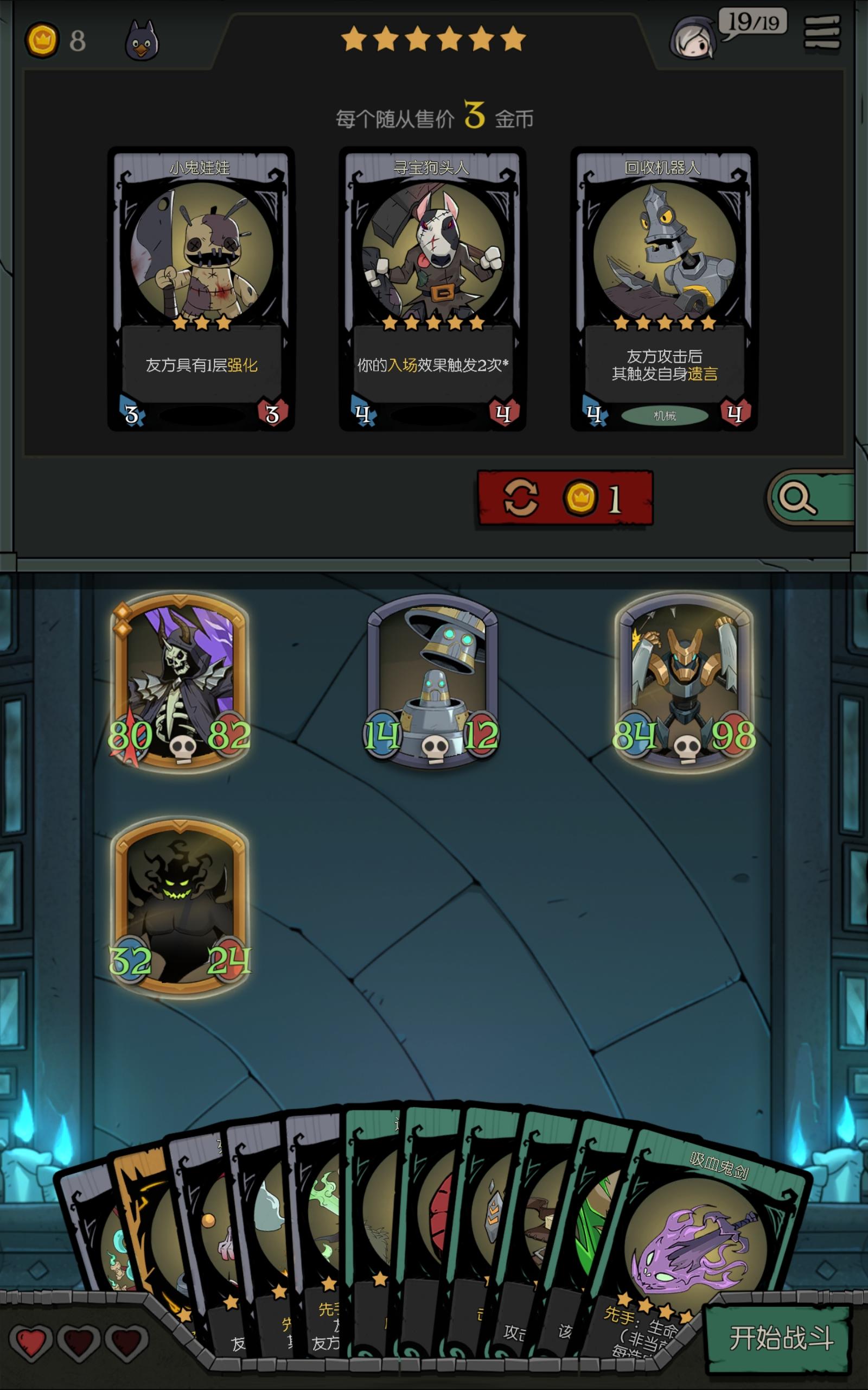机械套娃:入场:吞噬一个友方,获得遗言:召唤吞噬的友方的复制。那两个白的分别吞了一个队友,然后在商店买了第三个合成金色,会回到手牌,然后又可以再次入场……有几个遗言(●—●)