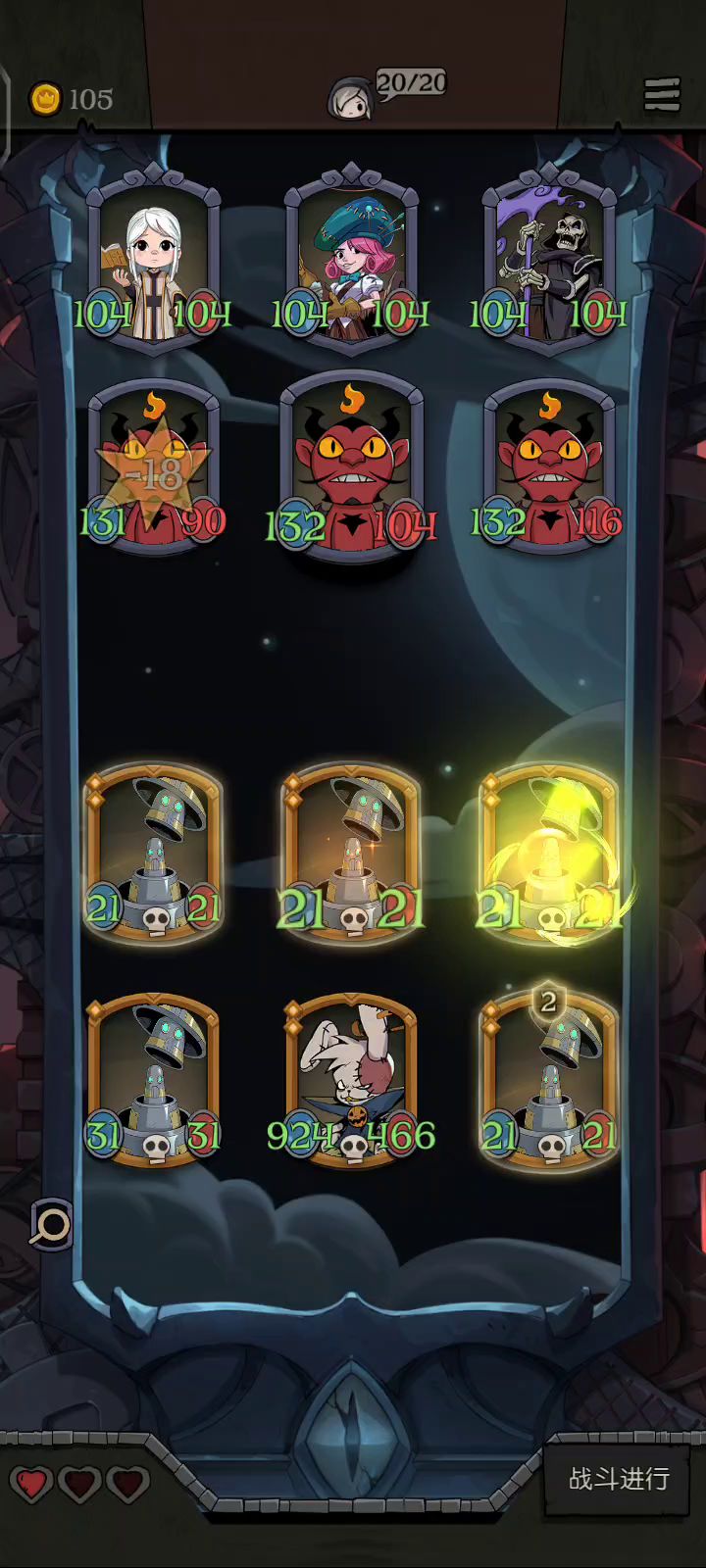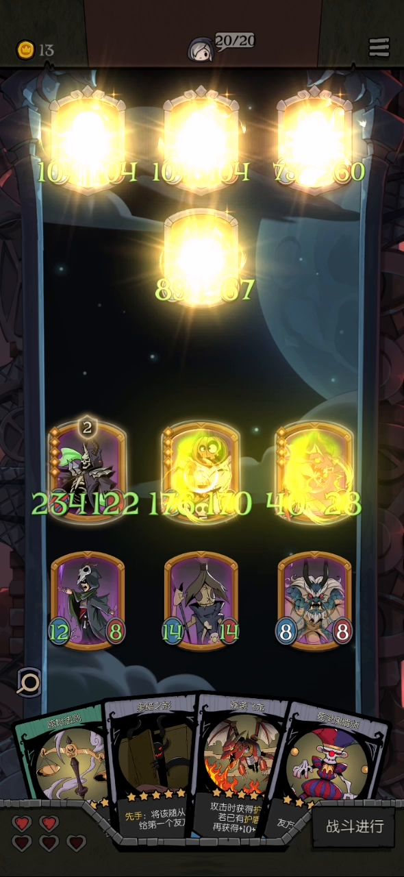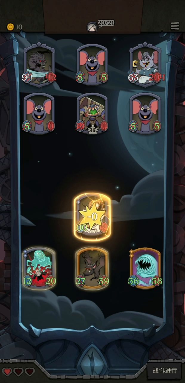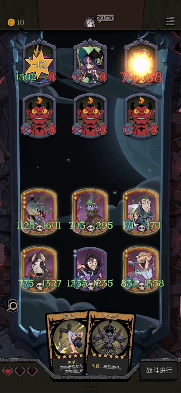 没有不败的牌组,不管你提前设想的多好,对敌刚好是克星,那铁凉了。 这次运气好,其实我这边组合不是非常完美,没怎么刷,随缘,但对被克的牌组,无论对方多么强大,也足够了。 再随缘,必须的搭配也肯定得有,角色不必很强(我这组三星四星都有),但必须互有联通: 思路是围绕击杀摆阵。关键角色灵魂亵渎者(击杀)和献祭者(共享击杀),key牌是自然印记(击杀获属性)和光剑(击杀获盾),还有强化类的角色或装备,我是鬼娃娃(强化),但不知道开始一波送它的技能是不是还存在着,还是随着它走烟消云散,我是假设加强一直在😸。 因为恰巧拥有反射镜(反伤),所以对我这组来说古堡幽灵(属性加倍)也很重要。 最后一关有的boss属性很变态,而且关键不是击杀么,我这组没击杀就没有一切发挥,所以上了幽怨之魂(随机2敌属性减半),而且带上了地雷蜘蛛,这就是开始必送的先驱者。 其实贪睡蝙蝠也很重要,因为前期我没献祭者(6星),也得通关不是。 说这么多,只是提供一个思路,没必要非组成这组牌,而且你不一定在最后遇到的是召唤流。我觉得月圆之夜最有意思的就是随机性,遇到什么,想办法让它组合起来,这样打起来很快乐,实在过不去或行不成阵法就算了,当然牌组再好遇到克星愿赌服输。如果开始就一门心思非要成什么固定形状,会很痛苦,失去了游戏的快乐。 莫执着。😉