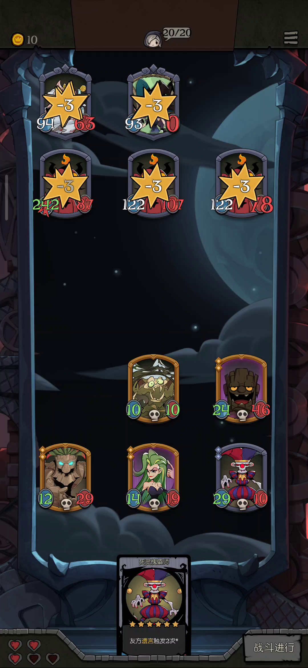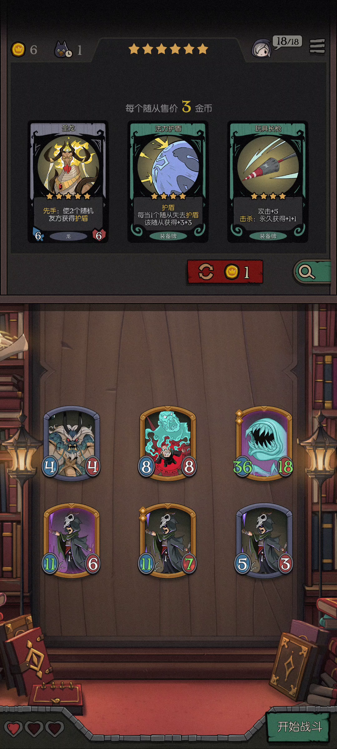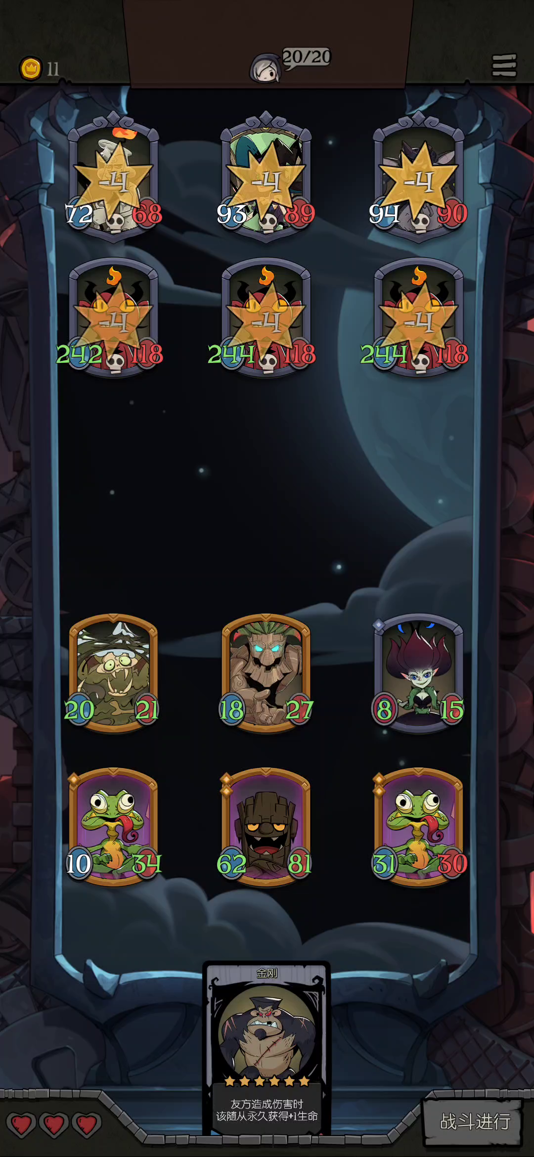 挺靠运气的,我本来是想完成12回合前升6星的成就,结果10回合过不去,只好花了钱,11回合没升到6星。早点拿到了蘑菇国王,运气好,能刷到高星牌,然后又拿到梦境之树,这家伙配合蘑菇国王真好用,一个免费送,一个卖了全阵容永久+2+2。