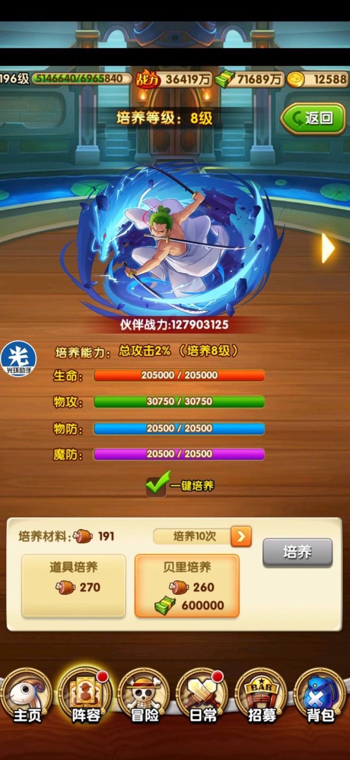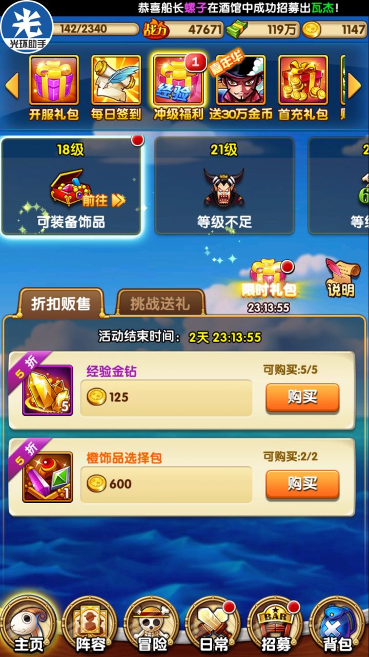 首先是一开始的18级冲级福利,以楼主V4小萌新来说,金砖不建议买,饰品可看金币适量买,毕竟低V金币要用好,土豪可随意接着是21级的冲级福利,装备结晶五万,贝利若干,低V不建议买,土豪另算,单人可考虑结晶买一买。27级福利,进阶海魂低V跳过,四人阵可以买紫色伙伴选择包开山治。有人说商店十连划算,但要2800金币,而且不一定出山治,前期四人阵先出个山治,过图很给力,不是单百万卡的这里可以直接跳过,