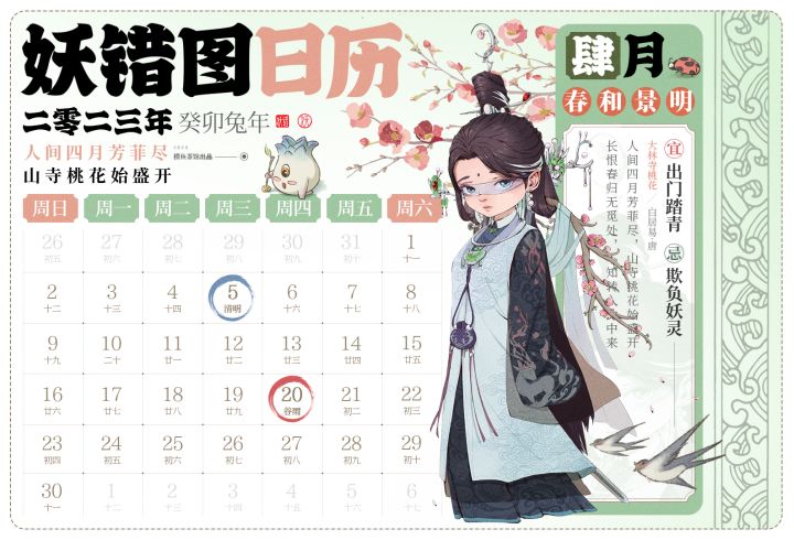 ▋▏摸鱼茶馆春暖花开的四月来啦。4月可是踏青赏花好时节,在小街中随意逛一逛,也是不错的选择!下面为掌门送上妖错四月日历,新的一个月也要常来茶馆做客哟(wink~*******************江宁小街近期新闻公布板: