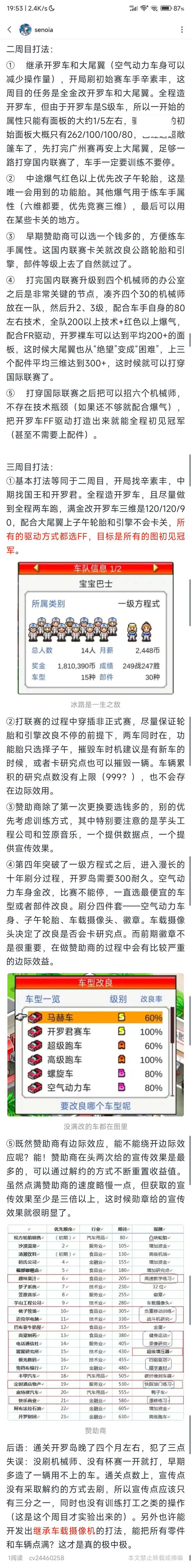 一周目4年1月2周速通开罗岛,已经非常极限了,这里有很多心得和大家分享。版本是pc版,现在也就pc版比较容易买了,无修改,需要sl,但是成就感还是非常的强。爆气的使用爆气在比赛前三名(最多三次)、大奖赛获胜或者待机一段时间后获得。爆气在初期用于训练,在中期用于升级赛车,在最后两场比赛用于正赛加速。根据我的观察,6维和450以上开始出现银爆气,600以上开始出现金爆气,每次爆气可以sl到更高