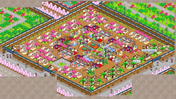 之前发过,但是玩了隔壁的游戏之后,我又有了新的思路,改出了一个更完美,包括所有设施与店铺的大布局图。为了向你们展示她的美貌,特地费了很大功夫拼出了一张全局图。别问我为什么缺两块,问就是无伤大雅,问就是懒。这是春天的景色,秋天的话右半部分会变成枫叶的红色,各有各的好看。下面是文字图,四个温泉都是不包括异性的全功效。Tips:1.追求高数值可以把跟功效不相干的植物全都改成梅树。2.文字图跟