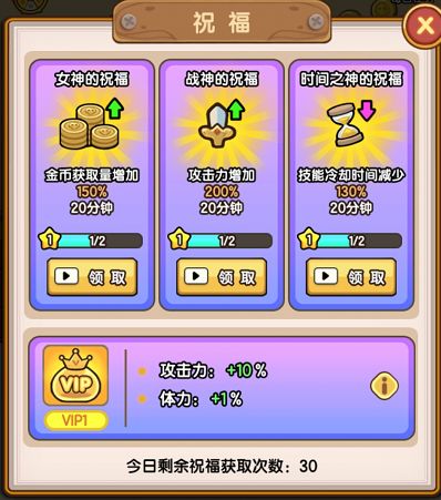 今天,小编来讲解一下祝福与加速的使用方法。我看很多人都在纠结祝福与加速限制次数的问题,其实小编个人认为,这并没有问题,原因在于两点:第一个限制次数可能是策划大哥出于限制游戏进度的考虑,毕竟如果无限祝福和加速,不如直接升级时给你升级两倍的攻击力对吧。第二个点在于其实这个功能是有策略性在里面的。下面让我来介绍一下祝福和加速的正确使用方式。 我们可以看到祝福中加攻击力和减少技能冷却,我们可以先用这两