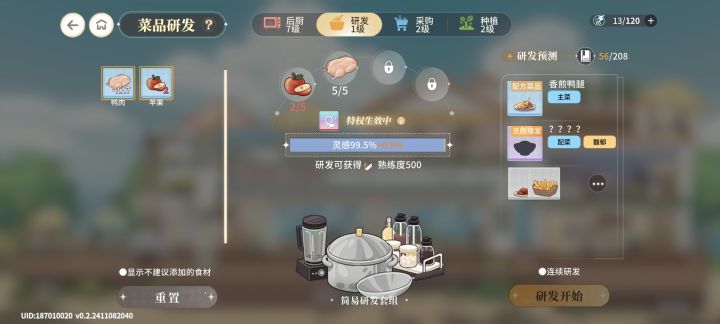无语……非我接受,欧我开心,但没想到一个烹饪系统能让我保底,我要食之契约都没这么难过,这还是我充了加灵感的那个月卡,不充我得浪费多少才能到保底然后才能获得一个甚至概率提升的紫色菜。上一次测试灵感爆发爆率没这么低,公测改低点我可以理解,但是肝了一天一宿加微氪下来感觉你这爆率改的太低了也。你这个菜除了影响普通货币获取和加那么点基本凑不齐的战力加成外貌似没有任何用处了,爆率还这么感人,也是招笑