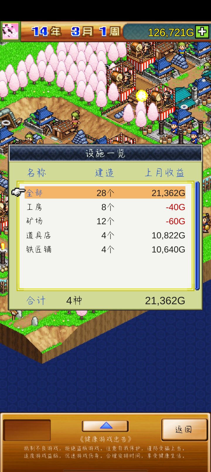 首先晒个收入图这是布局图。为了收益最大化选择了小饰品店,最贵的两个矿石一个树是140多币,每个区域大概2:1的矿场和伐木场,树木如图所见是在最后面一排种上,不管多远员工都会去后面伐木的,所以不要把树木种在前面浪费空间,工厂也要多,这样生产的速度快,食材树木矿石场旁边不用放花什么的提高生产力,因为后期员工太多了,可以交替换班,只要在小饰品店旁边放很多万花筒提高销售力更好升级村民打boss前期把轻