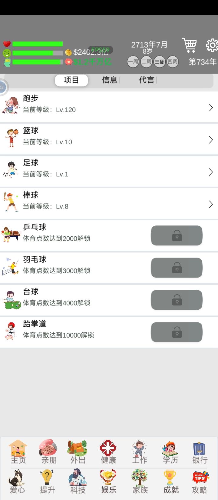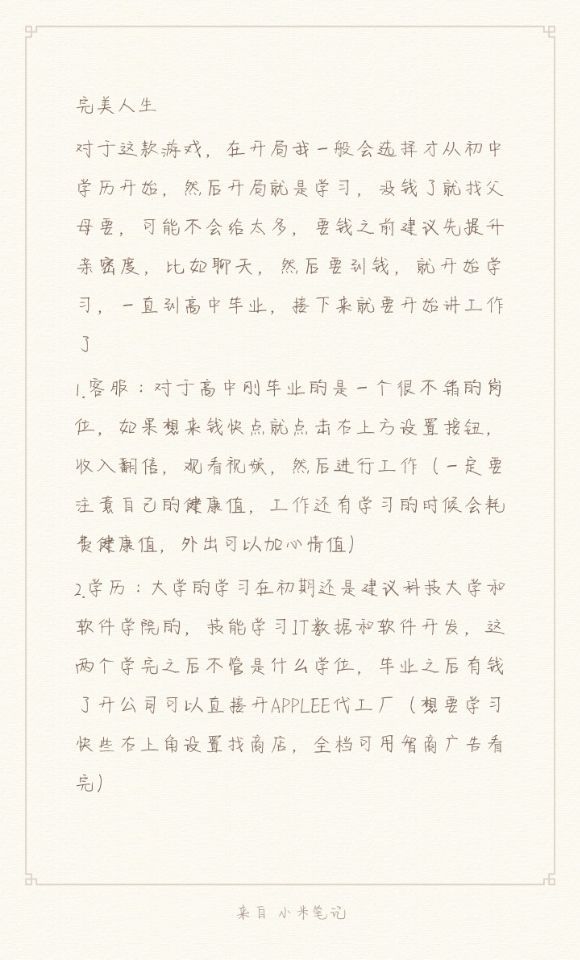 肝了几小时总结一下攻略一、前期(生存)1.看广告拿100生活费。2.看广告拿70万。3.看广告房子6折。4.18岁买房子租出去收支平衡就行了。二、中期(读书)1.去读书读什么专业都行大学本科就好了。2.技能读西餐制作。三、后期(工作)1.服务员干3年,后面创业要用。2.公务员存钱。3.边工作边收房租等遗产,钱够了去创业。四、创业1.越是前面的公司创业的钱,就越少。2.