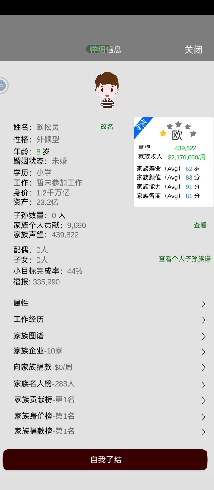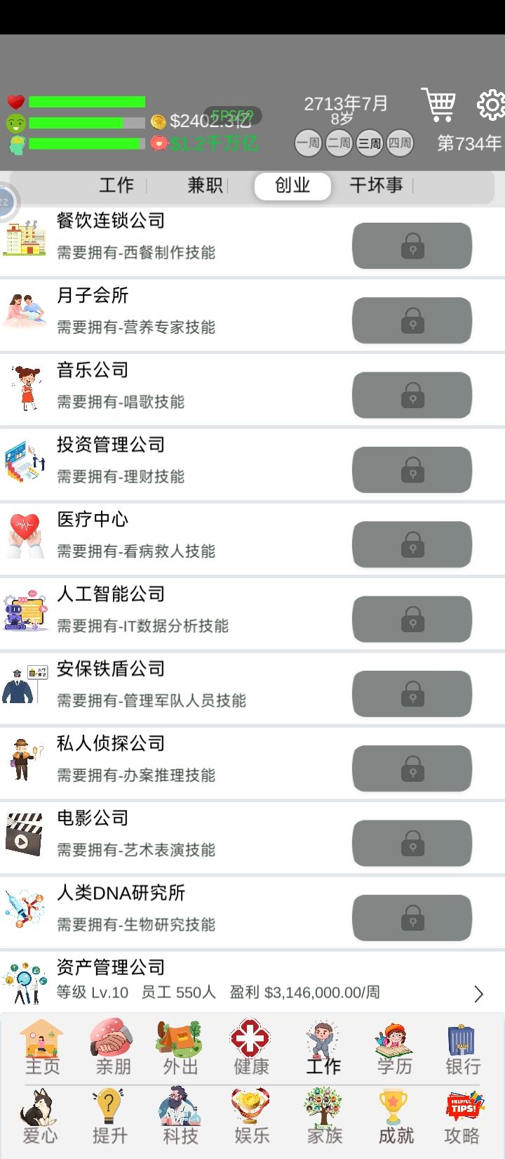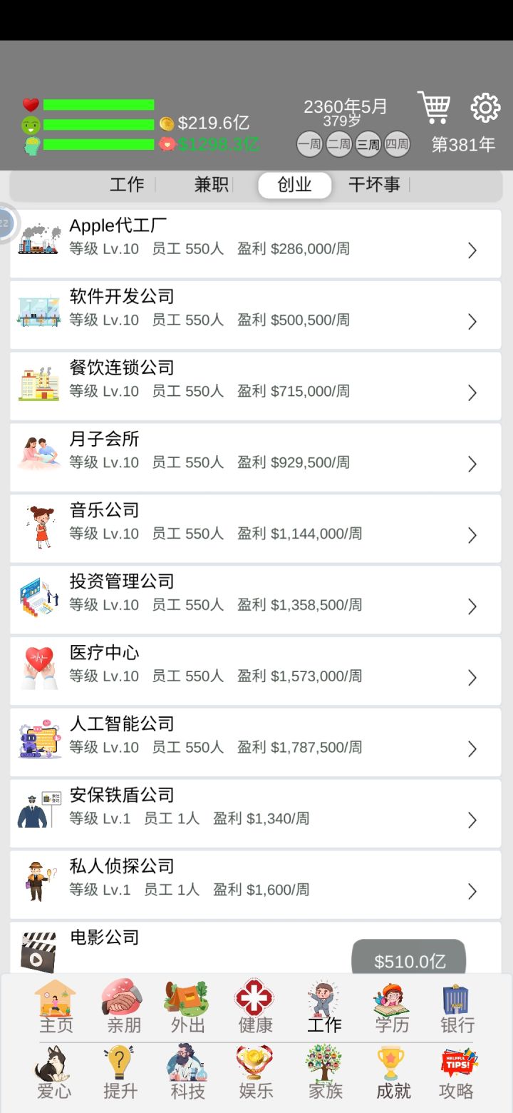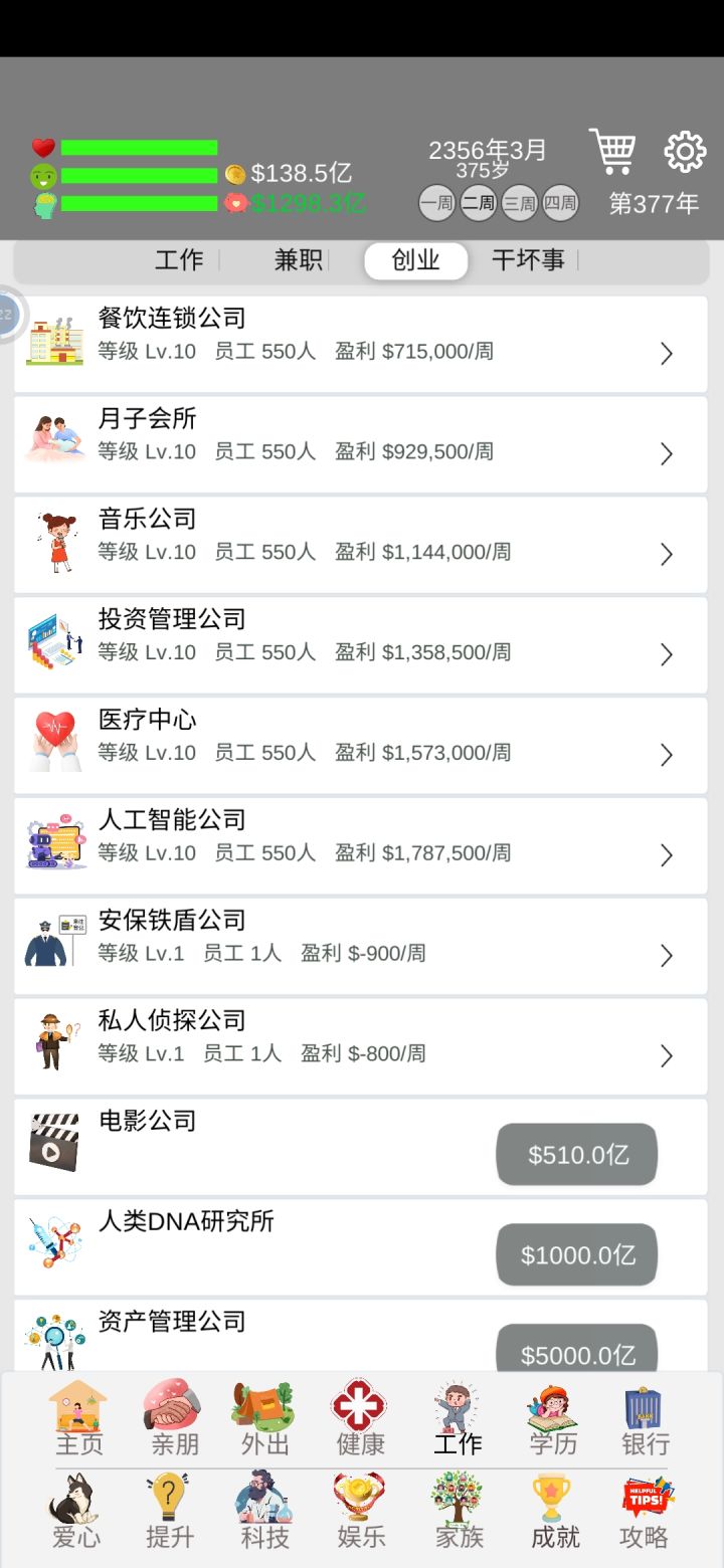 千万千万不要建造那个公司因为你会发现一直在亏并且那个你建造的时候钱要很多你出售的时候出售获得的钱就比你创造公司的钱少职业建议选那个公务员或者五级法官到最后获得的钱都比较高性价比的话五级法官性价比最高虽然获得的钱是职业中第二但不过减少的属性比第一名少性价比第一名是五级法官获得的钱最多的是公务员建议在前期就结婚因为后期基本没有未婚的并且你结识的朋友岁数都和你差不多并且你没有后代的话那一生获得的钱就