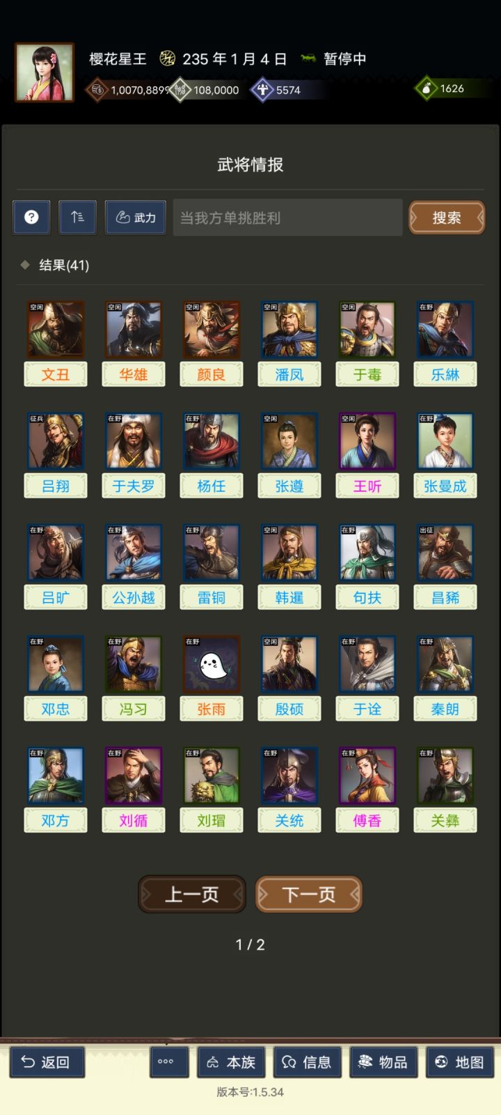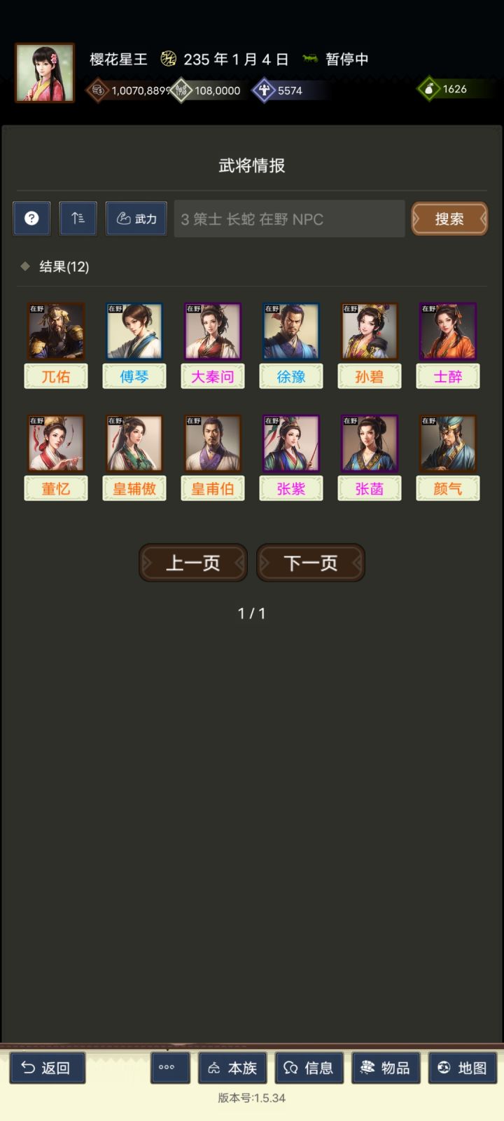 情报是相当重要的功能,我们要坚持人才强族战略,通过获取情报来抓地图上是好武将,好策士,好挂件1.点击框1三点展开全部功能2.点击框2情报进入图一所示界面3.情报具体能搜索啥?点击图二框1即可见框4说明,点击图二框2可切换排序(按照框3属性升降),具体排序属性见图三4.举例,搜索当前3血脉具有策士属性且自带长蛇阵型的在野NPC武将,如图四5.情报功能还能够搜索结婚对象如男