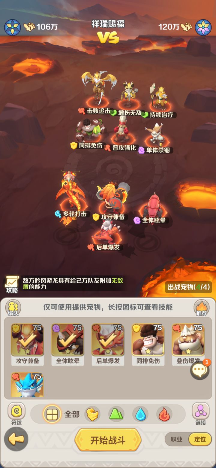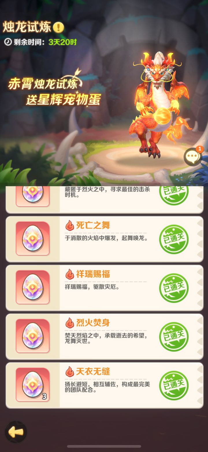 【赤霄烛龙试炼送星辉蛋】闯关阵容解答:开心【熊熊烈焰】比心火海之中,烛龙降临。炽火醉龙1号位、赤霄烛龙2号位。【定点打击】吃瓜若能控制火海的燃烧范围,或许会有意外之喜。炽火醉龙2号位、赤霄烛龙5号位。【层层烈焰】泪目不断升温的热浪,点燃爆发的征兆。噗噗火鸡1号位、怒焰狂牛2号位、赤霄烛龙3号位。【以静制动】尬笑