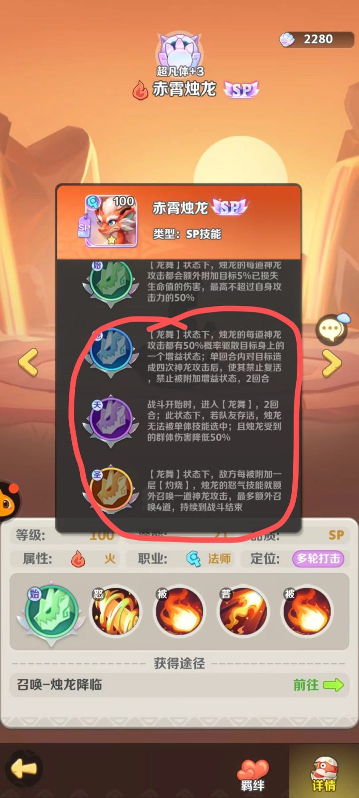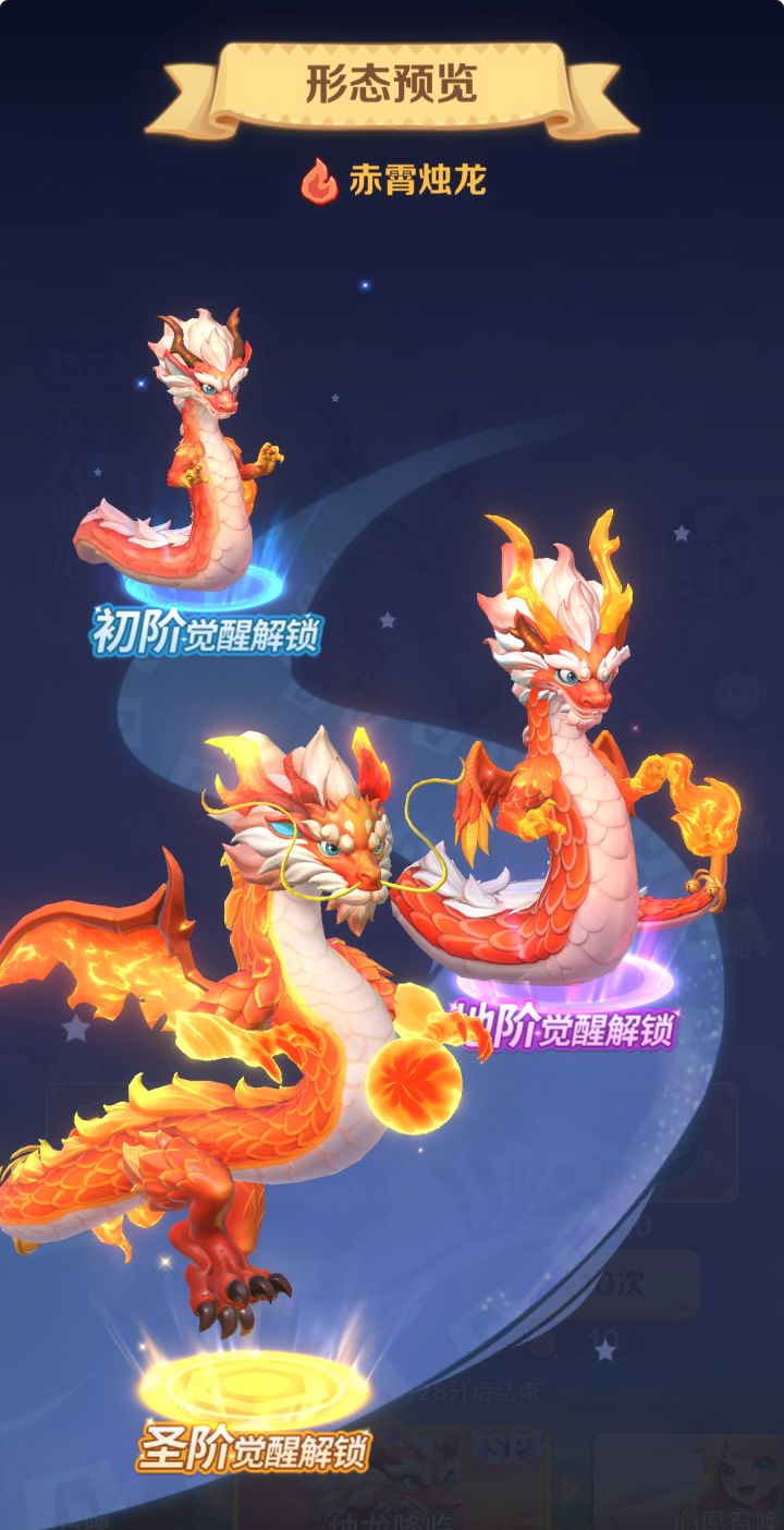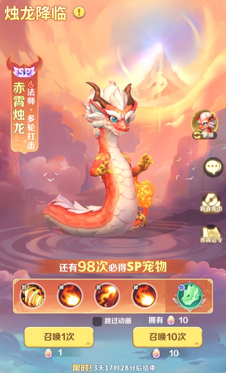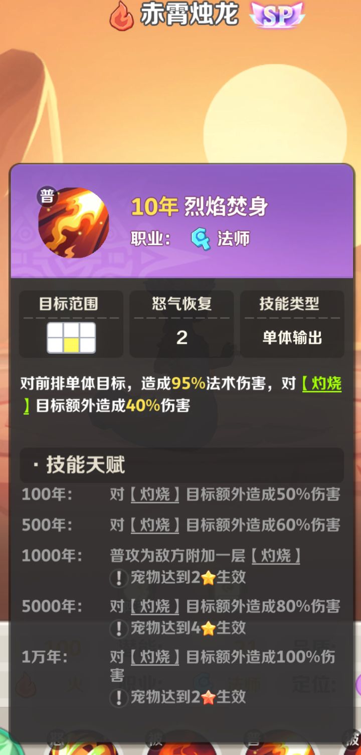 火系SP宠 - 赤霄烛龙(养成建议)【小名】:火龙、烛龙、蛇龙【抽蛋难度】:★★★★★【宠物强度】:★★★★★【特点】:火系新晋SP宠,主打多轮加成伤害。【下位替代】:无替代宠物。【定位】:建议火系强攻法队伍使用。【兽灵】:森林神鹿4件套+烈焰暴龙2件套,主打少数回合爆炸增伤优先。【龙骨效果】:攻击百分比优先、生命百分比其次,再没有暴击、攻击也可以。【通用龙骨】: